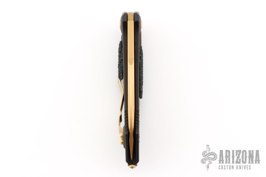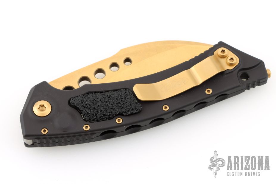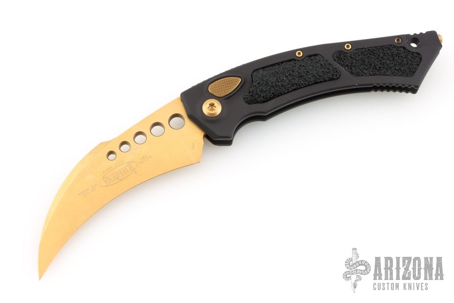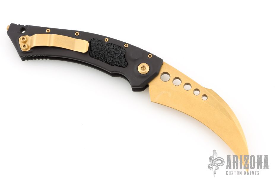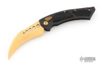 This Hawk Auto by Microtech Knives features a stonewashed hawkbill blade that has been gold plated by PVK. The handle has a black aluminum frame with blasted stainless steel hardware and tip up clip. Dated 08/2019 and s/n 198 Proof Run. Comes with original box and papers. Excellent condition.