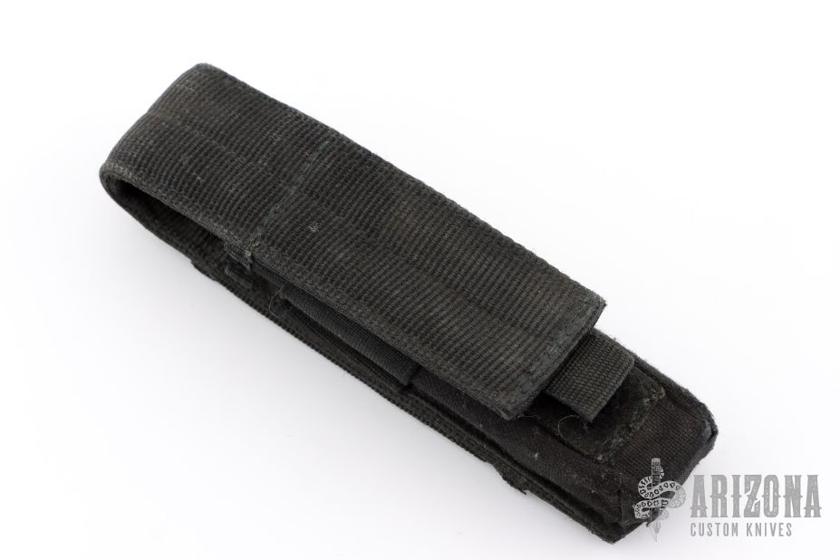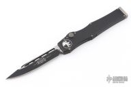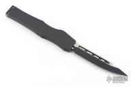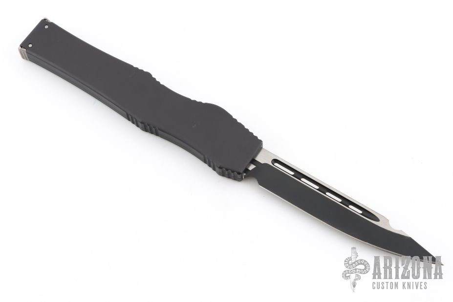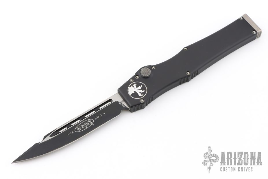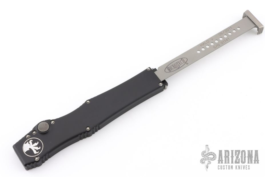 This Halo V OTF automatic features a black clip point blade with a single edge. The handle is black aluminum. Push button release. Charging handle is marked "Microtech", dated 04/2014 and S/N 04951. Comes with original box, papers and sheath. Has some light scuffs, otherwise excellent condition. Dated 06/2011 and s/n 01741.