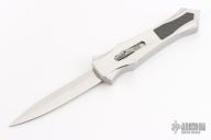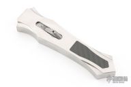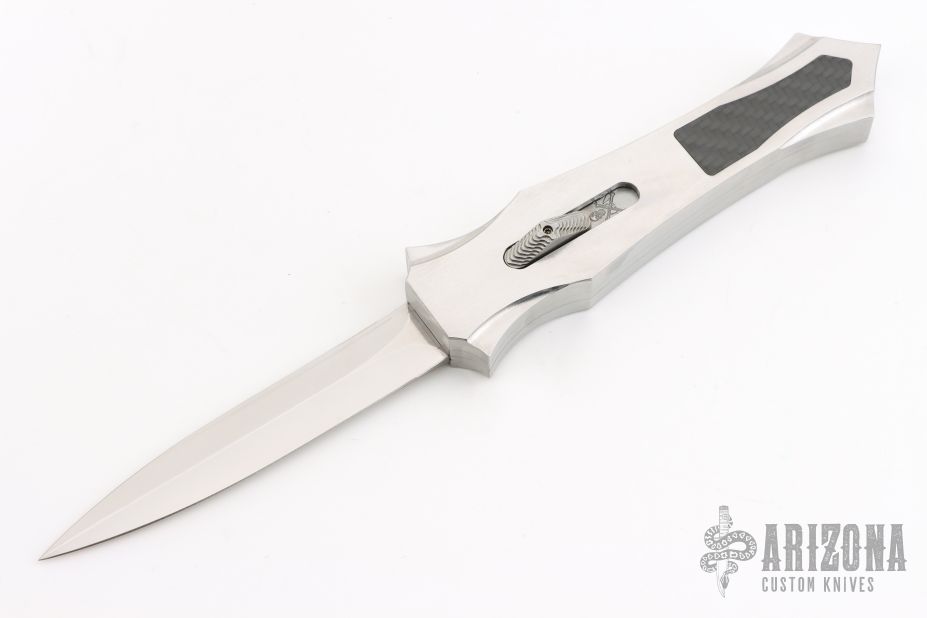 This Burn Custom Stingray OTF has a hand rub satin finished hollow ground double edged blade. The chassis is cut from 416 stainless steel with a satin finish, has 3k Carbon Fiber inlays. Blade deploys with authority and locks up tight with minimal blade play. Has a few light scratches, otherwise excellent condition. Comes with a COA dated 11-28-18