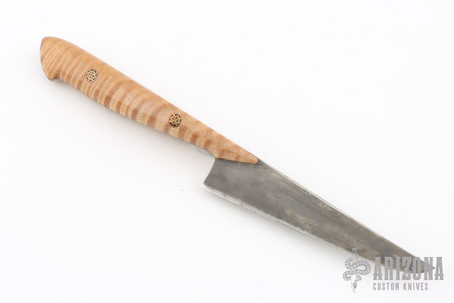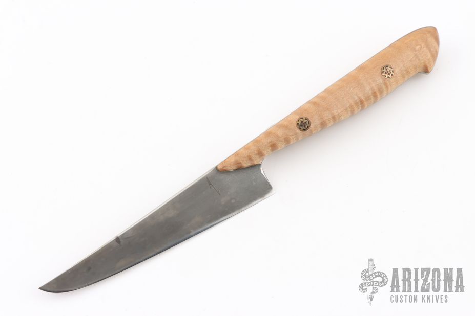This paring knife from Moriah Cowles of Orchard Steel feature lightly blued and hand rub satin finished blade with .090" blade stock and .999" blade depth, full tang construction with curly maple scales and mosaic pins. Has been lightly used, has some patina and light scuffs, otherwise good condition.