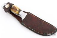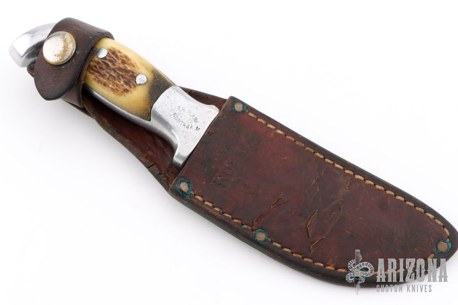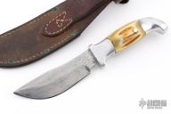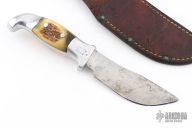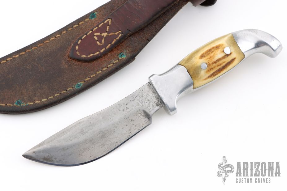 This Skinner by Rudy Ruana features an upswept blade with false top edge with .121" blade stock and 1.175" blade depth, hidden tang construction. The handle has a cast aluminum grip with elk horn inlays. Comes with original brown leather sheath. Has some scratches and patina on the blade, otherwise good condition.