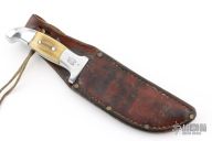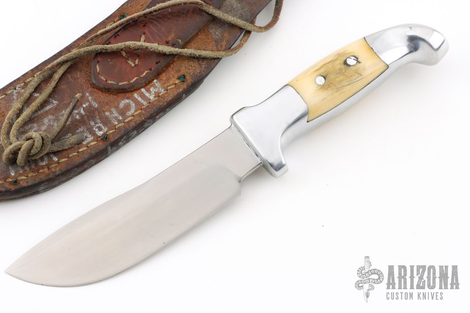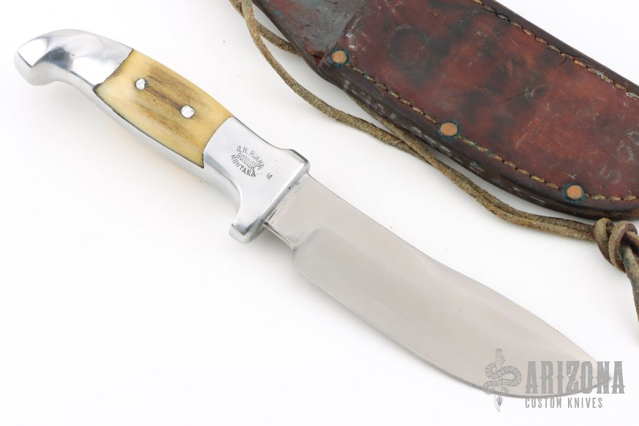 This Skinner by Rudy Ruana features an upswept blade with false top edge with .175" blade stock and 1.317" blade depth, hidden tang construction. The handle has a cast aluminum grip with elk horn inlays. Comes with original brown leather sheath. Has some light scratches, otherwise excellent condition.