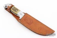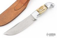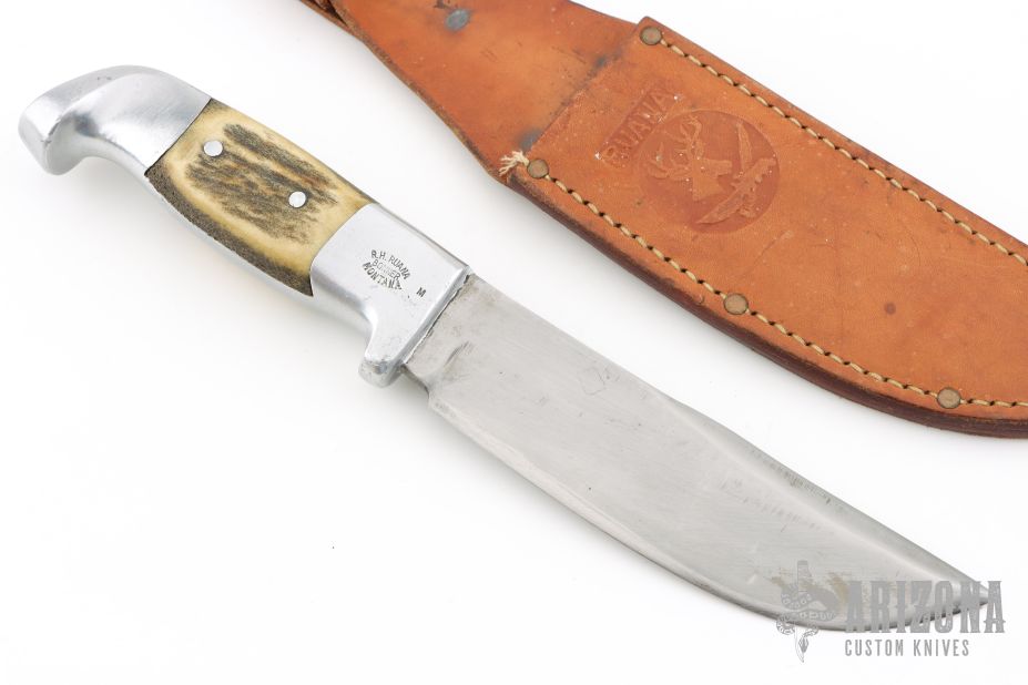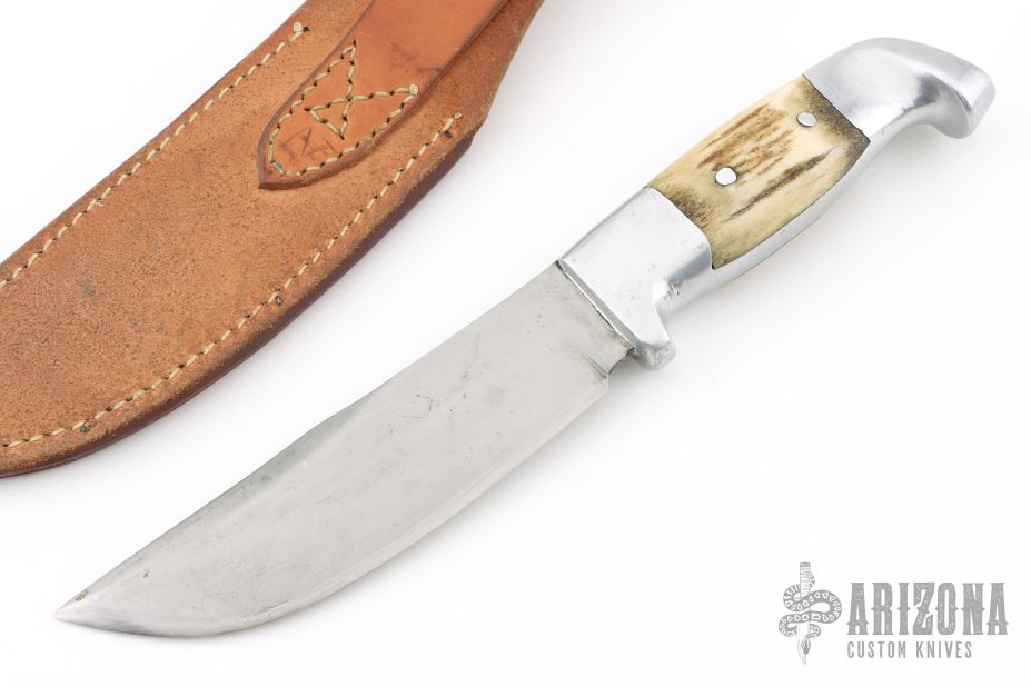 This Model 17A Skinner by Rudy Ruana features a satin finished blade with false top edge, .180" blade stock and 1.536" blade depth, hidden tang construction. The handle is cast from aluminum with elk inserts. M Stamp. Comes with brown leather sheath. Has some scratches and patina, has been resharpened, otherwise good condition for its age.