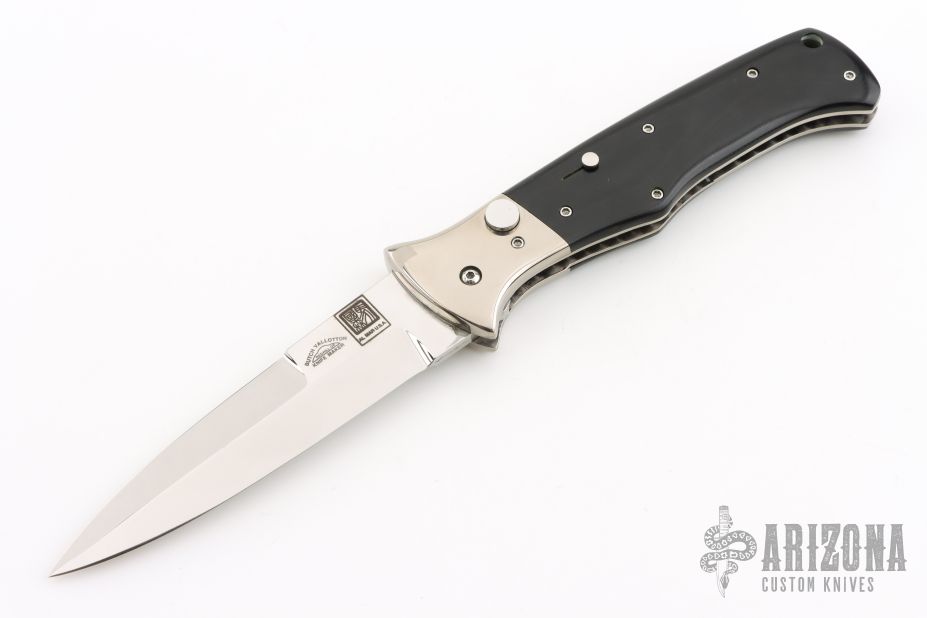 This SERE Auto linerlock folder is a collaboration between Al Mar and Butch Vallotton. It has a mirror finished spear point blade with a false top edge. Handle has polished stainless steel bolsters, black linen micarta scales, titanium liners with jeweled interiors, and a polished stainless steel backspacer. Has safety. Has a few light scratches, vertical blade play, lock rock, blade won't stay closed for very long before it fires on its own, otherwise good condition. #022 on blade. Comes with a zippered case. I'm sure it could be repaired by the Vallotton Family.