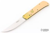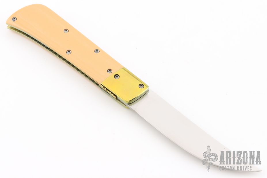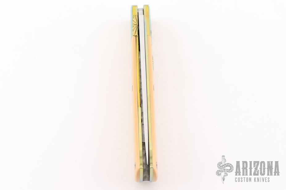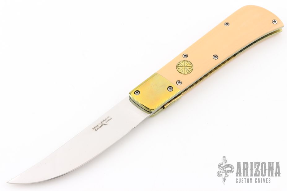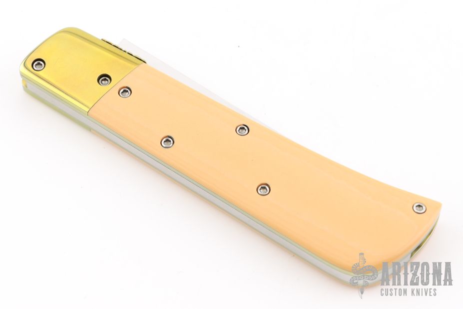The side-opening, Persian Automatic, by Rainy Vallotton, features a mirror polished upswept blade. The handle has anodized and anodized titanium bolsters, micarta scales, anodized and titanium liners, and a polished and stainless steel backspacer. The knife has a strong and fast leaf spring action. Has a little vertical blade play, otherwise excellent condition.
