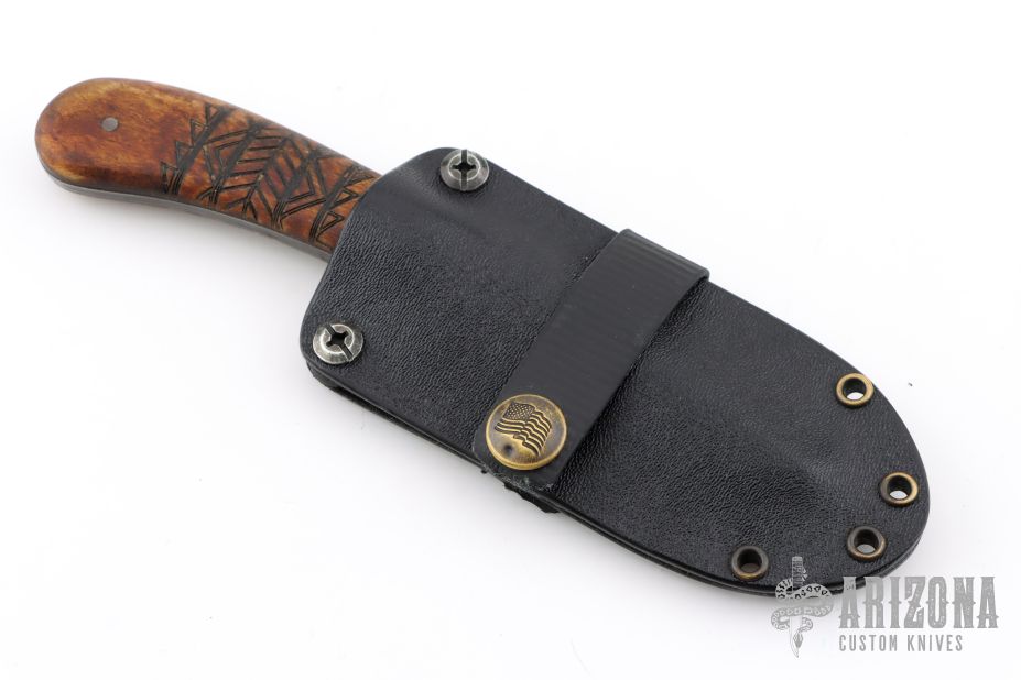 This SD2 by Winkler II features a Caswell treated blade with fileworked thumbrest, .209" blade stock and .941" blade depth, tapered tang construction. The handle has pinned tribal maple scales. Comes in a Listing also includes leather-lined Kydex sheath. Has scuffs, scratches, and the knife has been resharpened. Good condition otherwise.