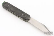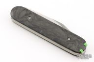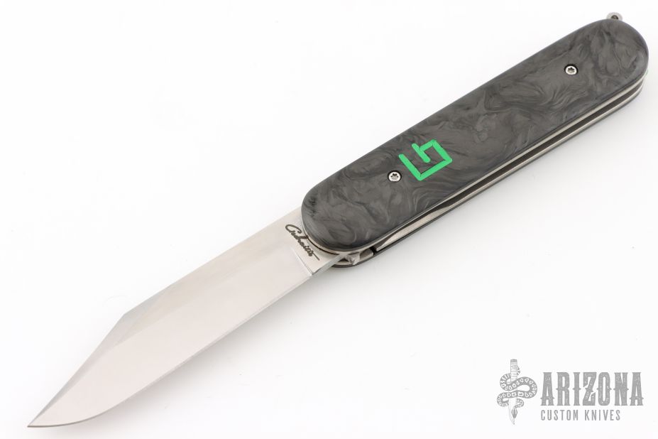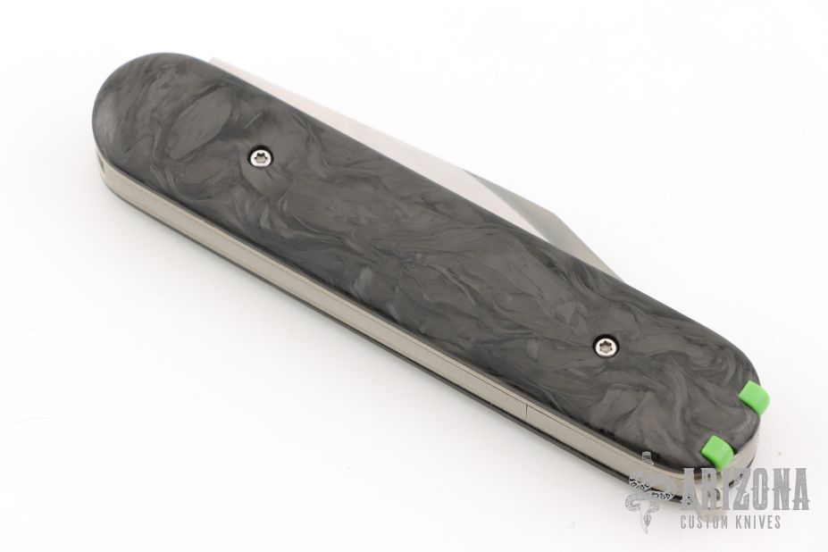 This Switch Army Switchblade by Chuck Gedraitis features a satin finished blade with false top edge. The handle has marble carbon fiber scales with green G, orange peel finished titanium liners, orange peel finished stainless steel backspacer with lanyard hole. Has tweezers and toothpick like a Swiss Army Knife. Nice action, lockup and blade seating. Comes with a zippered case. Has a couple very light scratches, otherwise excellent condition.