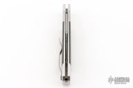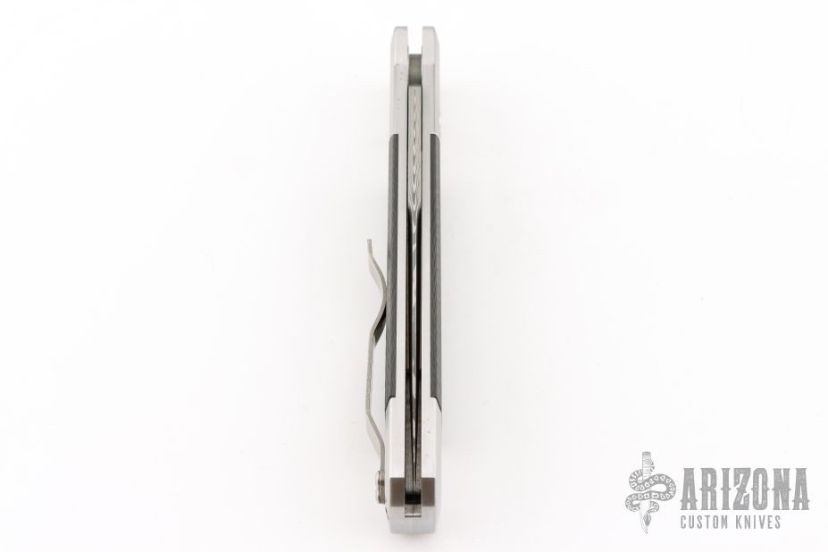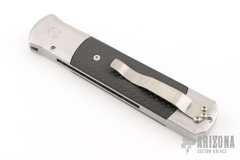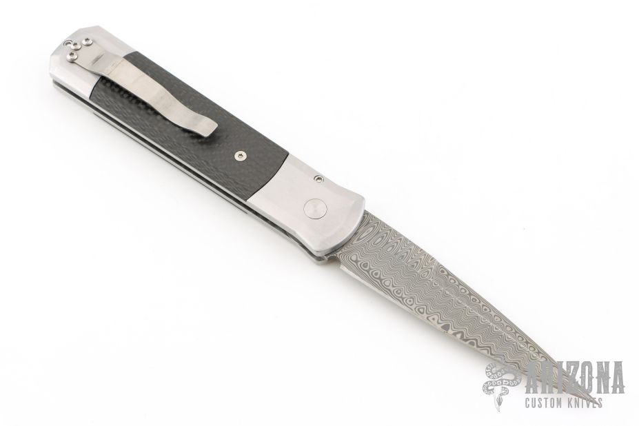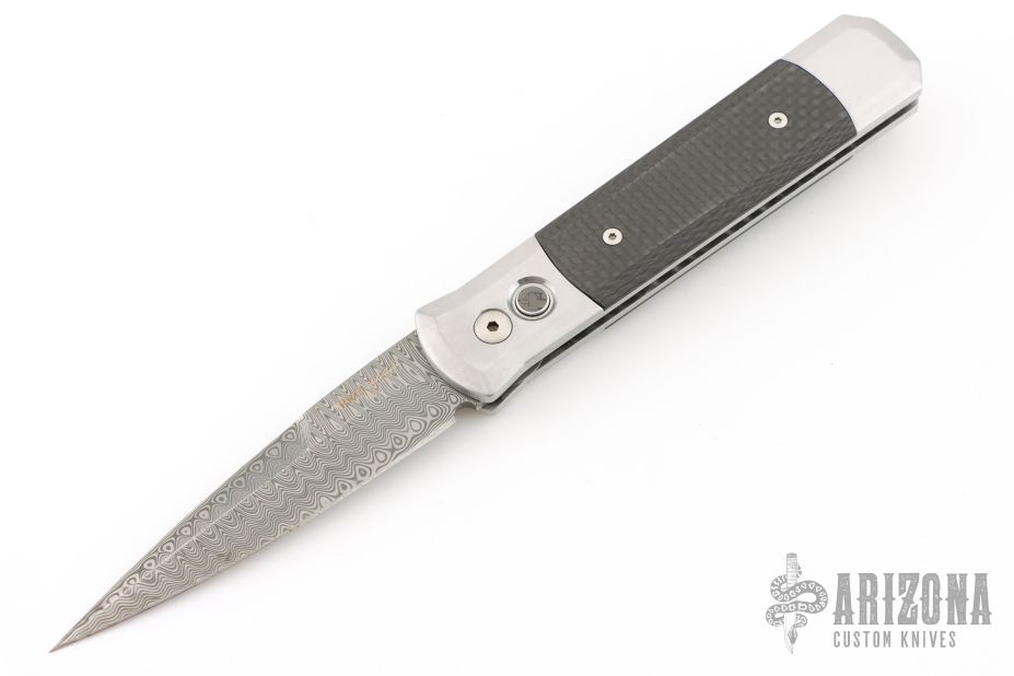 This Custom Godfather by Protech Knives features a Damasteel blade. The handle has a satin stainless steel frame with carbon fiber inlays and a carbon fiber inlaid button. Tip up satin finished titanium clip. Comes with original box and papers. Has some scratches, good condition otherwise.