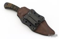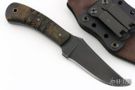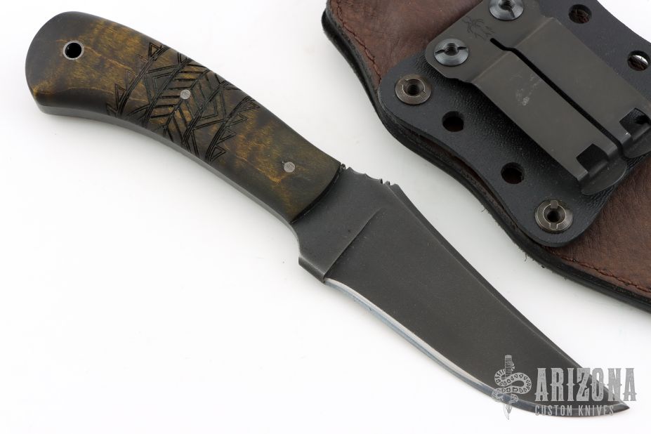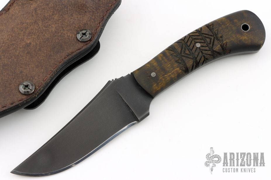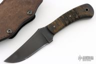 This Blue Ridge Hunter by Winkler II features a Caswell treated blade with fileworked thumbrest, .210" blade stock and 1.42" blade depth, full tang construction. The handle has pinned tribal maple scales. Comes in a Listing also includes leather/kydex sheath. Has a couple light scuffs, excellent condition otherwise.