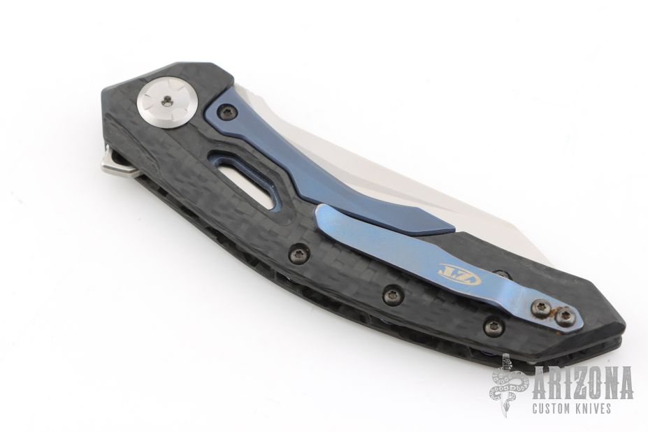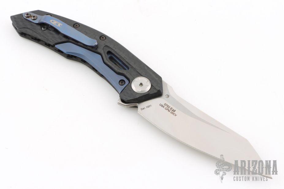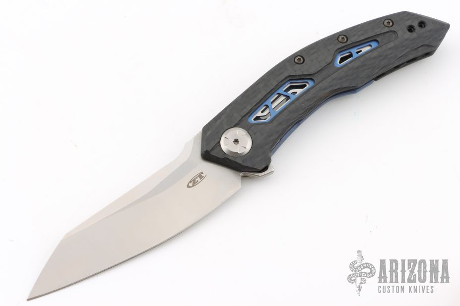 The ZT 0762 is a unique knife with supreme features. The wharncliffe blade has a two-tone satin and stonewash finish. Being made of CPM-20CV, the blade is heat treated and has exceptional hardness. The carbon fiber handle has blue anodized hardware accents with handle windows in the frame. Titanium sub-frame lock with a hardened steel lock bar insert. The ZT Tuned Detent System (TDS) is fine tuned so the detent is not too heavy or too light, providing consistent open and closing action.