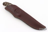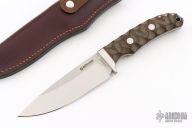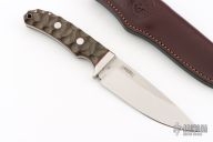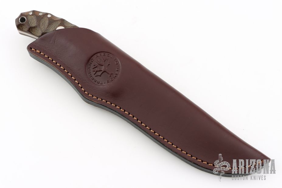 Well designed drop point hunter/utility with sculpted canvas micarta scales for a solid grip.  Brushed stainless guard, pins, and lanyard tube. Full tang construction with thickness of 1/8" and depth of  1 1/4". Comes with a brown leather sheath. #788. Excellent condition.
