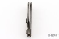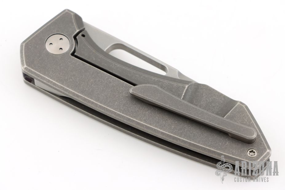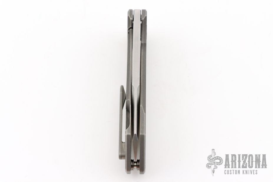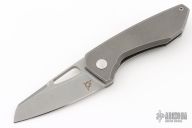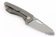 This M11 features a stonewashed sheepsfoot style blade with a large thumbhole.  The handle features a dark titanium frame with a matching tip-up pocket clip.  Includes a milled aluminum display case and COA dated 09-2025.  Nice detent, lock up and blade seating.  New from maker!