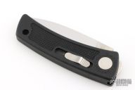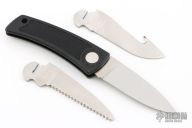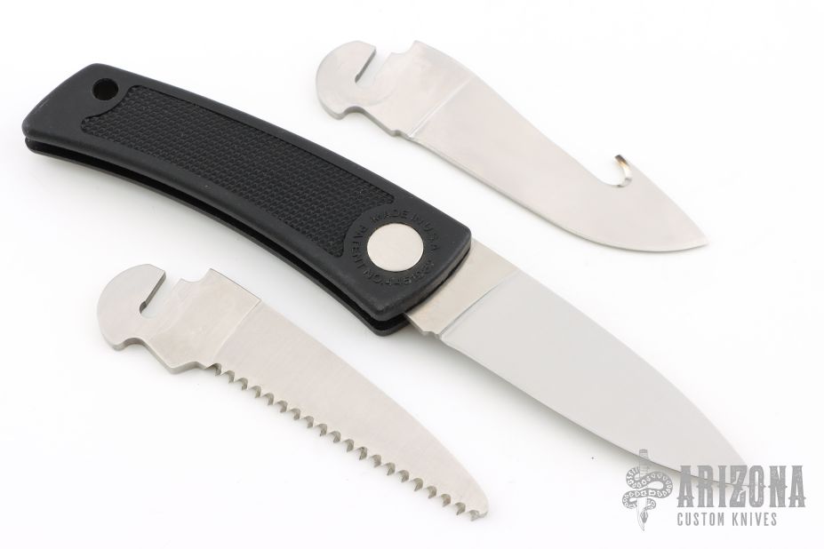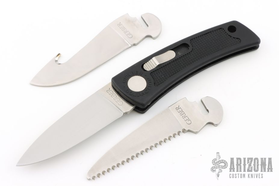 This Bolt-Action Exchange-Blade knife by Gerber features a black FRN frame with locking switch that also allows the blades to be changed. Comes with a Utility blade, Skinner blade with gut hook, and a saw blade. All packaged in a black nylon sheath. Excellent condition.