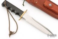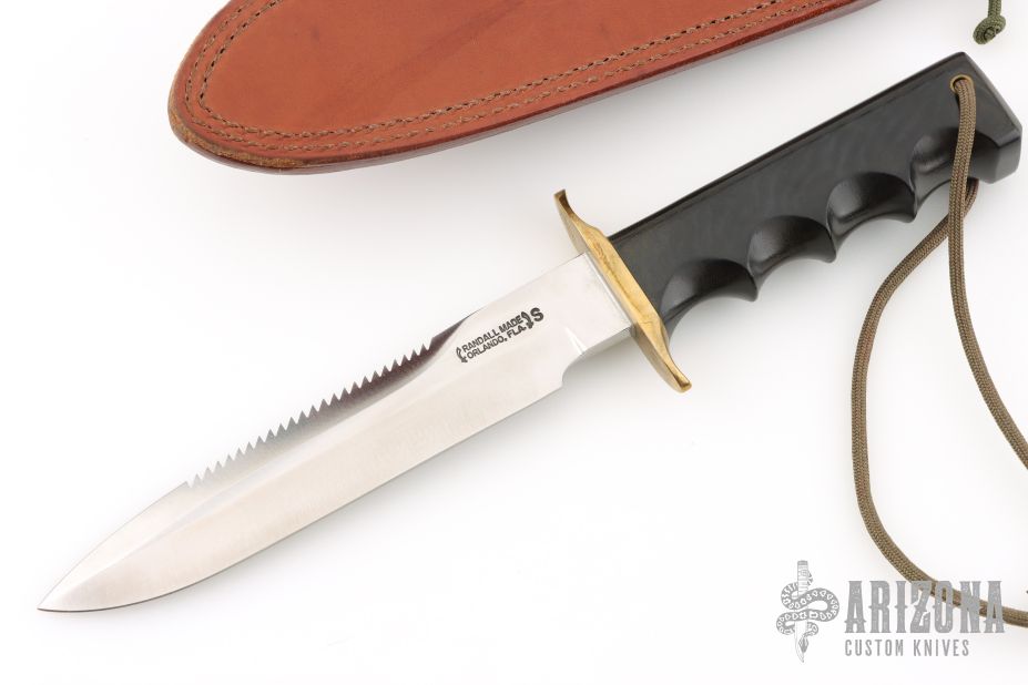 The Model 16-7 Diver or Special Fighter was designed especially for heavy-duty salt water use and is as nearly indestructible as possible. This knife has a stainless steel blade with sawteeth and sharpened top edge, .231" blade stock and 1.224" blade depth, full tang construction. The handle has a brass guard, black linen micarta finger groove handle with a lanyard hole. Comes with a brown leather sheath. Excellent condition.