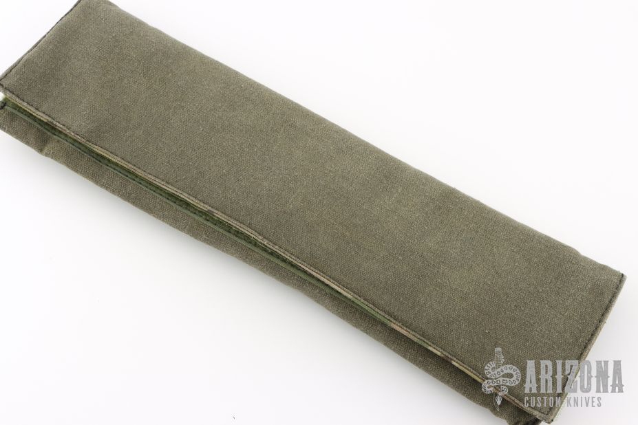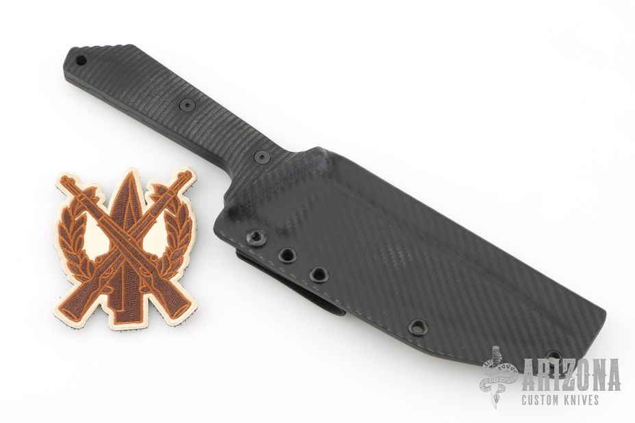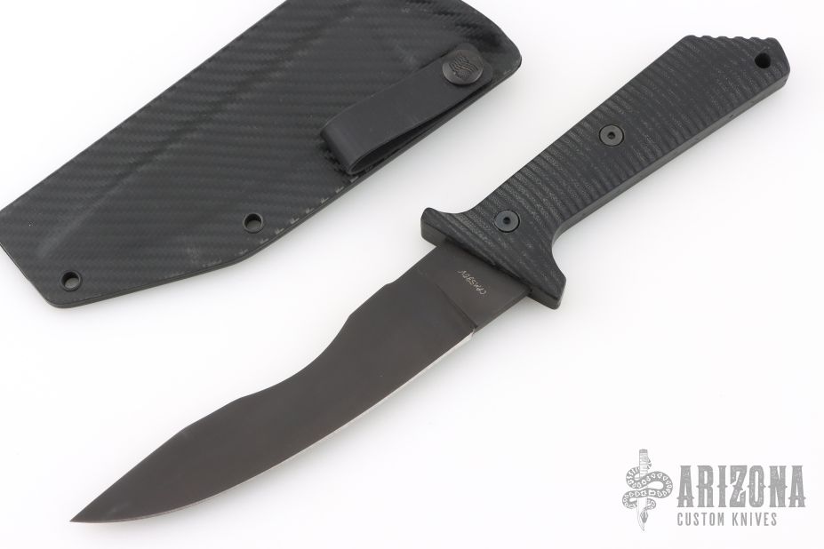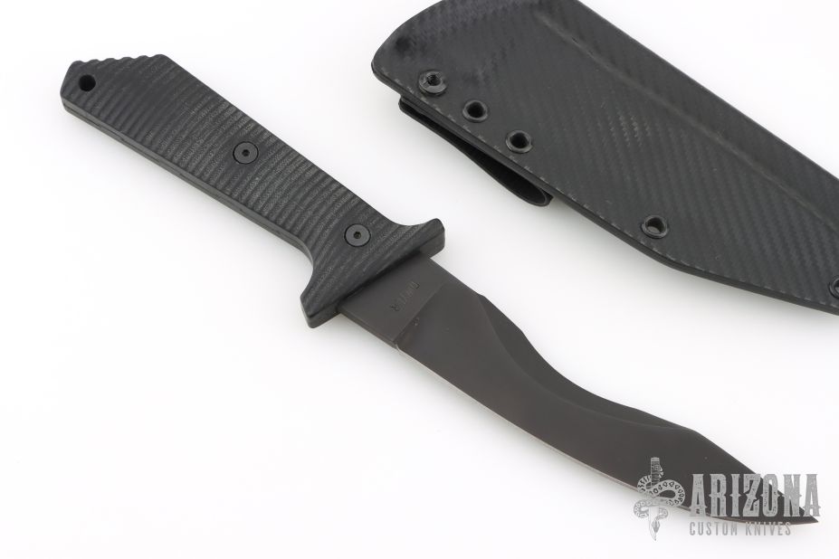 This knife by Duane Dwyer features a black blade with a sharpened top edge, .252" blade stock and 1.327" blade depth, hidden tang construction. The handle has black G-10 dovetailed grip. Comes with a Kydex sheath and canvas Velcro case. Excellent condition.