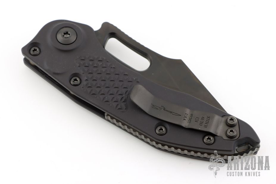 This Stitch Auto by Microtech Knives features a fully serrated DLC tumble finished blade and false top edge, notched thumb and finger rests. The handle has a black anodized and milled aluminum handle with a black backspacer, stainless steel hardware and clip, tip up carry, lanyard hole at the butt. Comes with original box and papers. S/N of 124 and dated 03/2022. Excellent condition.