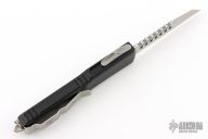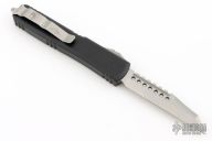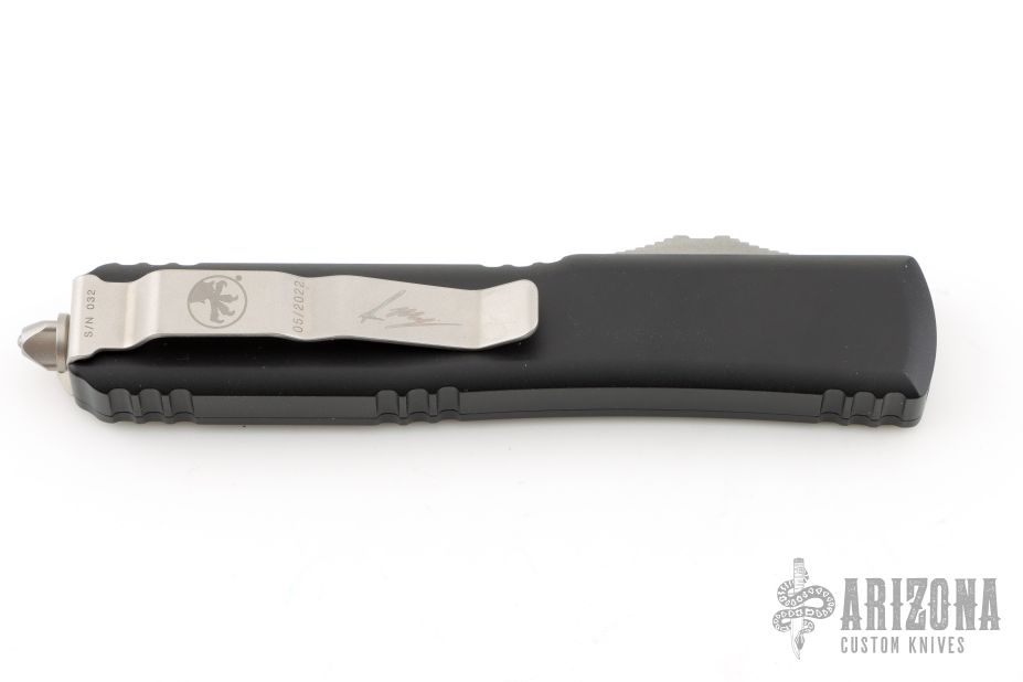 This Ultratech by Microtech Knives features a stonewashed Warhound blade with satin flats and false top edge. The handle has a black aluminum frame with tip down blasted stainless steel clip and hardware. Comes with original box (signed) and papers. 05/2022, S/N 032. Excellent condition.