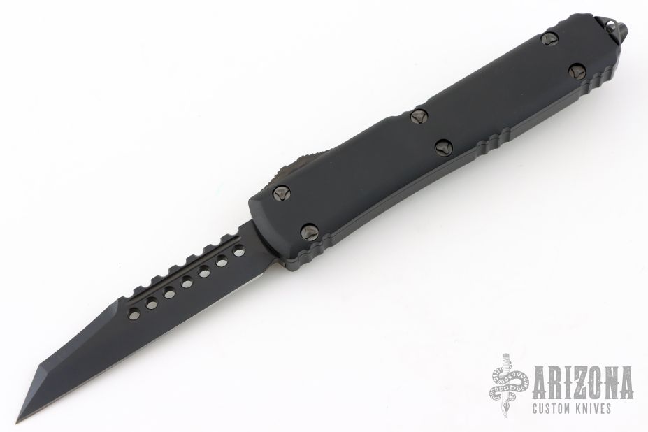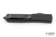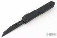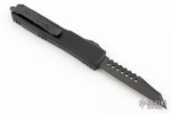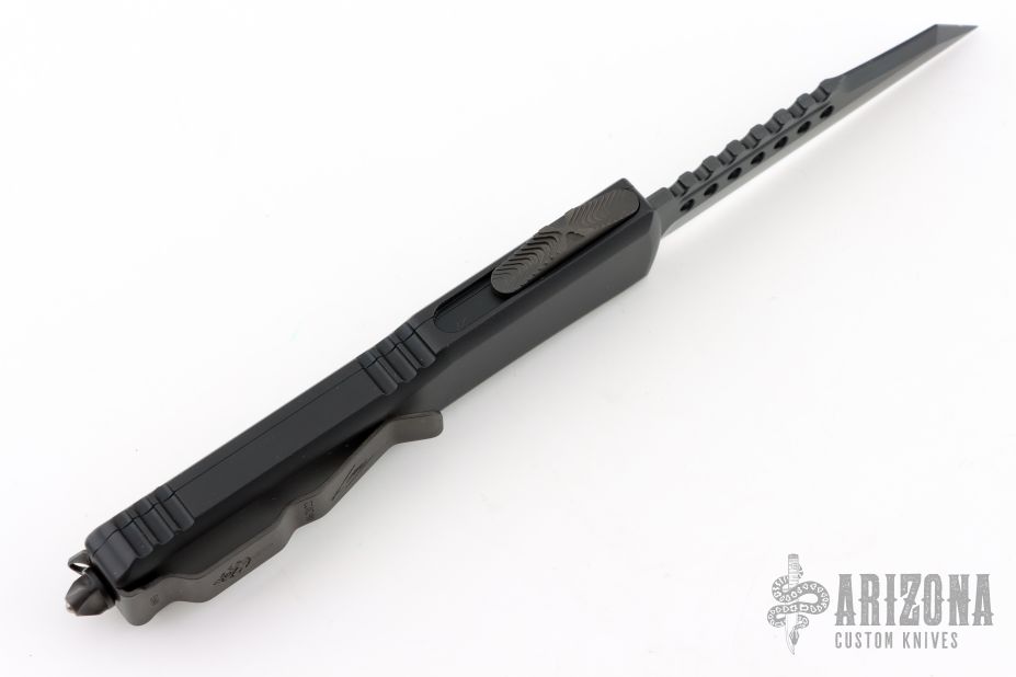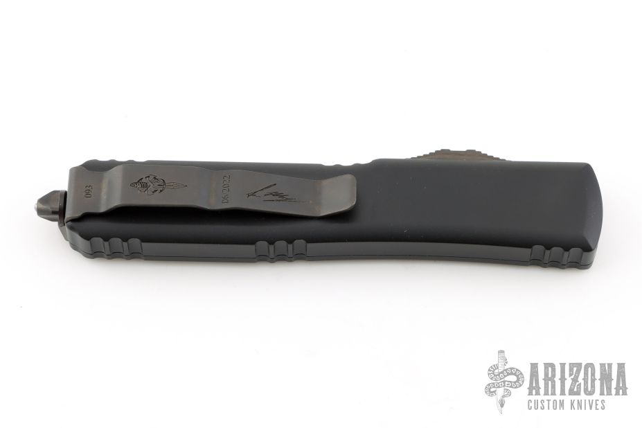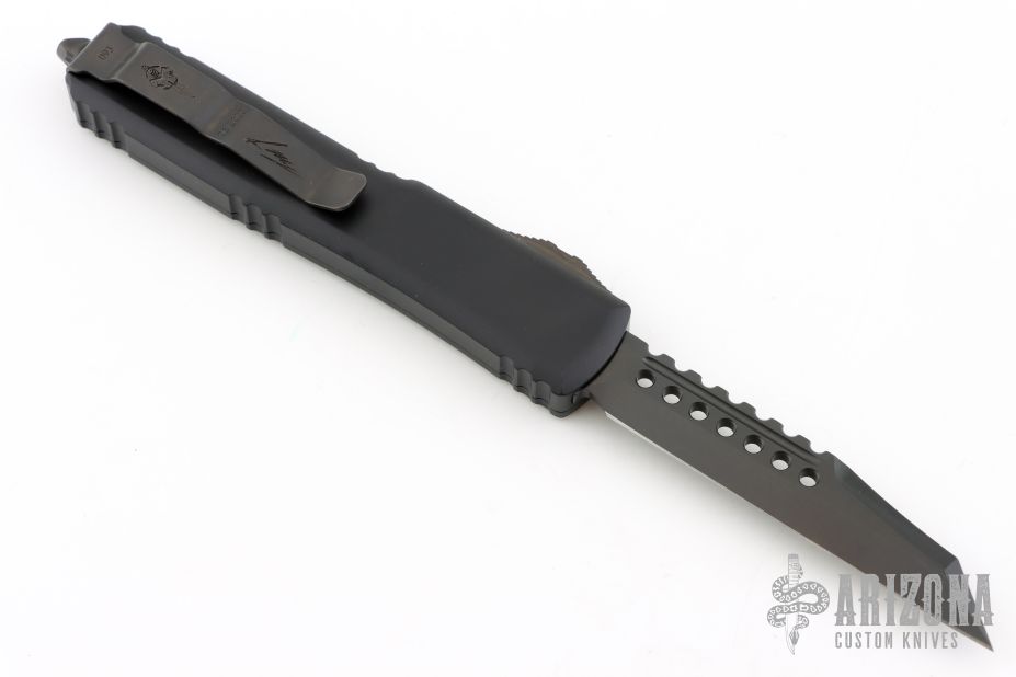 This Ultratech Warhound by Microtech Knives features a black stonewash DLC blade with notched thumbrest and fullers, false top edge. The handle has a black aluminum frame with tip down black stainless steel clip, black DLC hardware, black titanium thumbslide. Comes with original box (signed) and papers. Dated 06/2022 and s/n 093. Excellent condition.