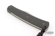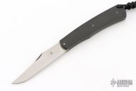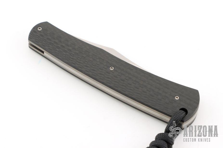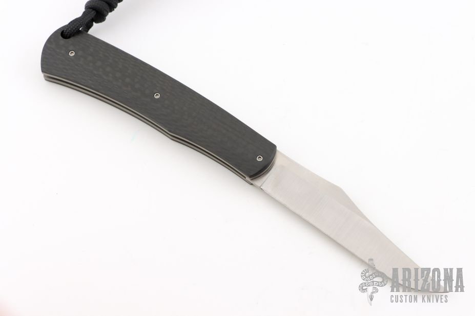 This knife by Jason Clark features a satin finished clip point blade with a single nail nick. The handle has bead blast finished liners, carbon fiber covers and steel spring. This is a double detent slip joint. Has half-stop. Comes in a WE Knife zipper case. Excellent condition.