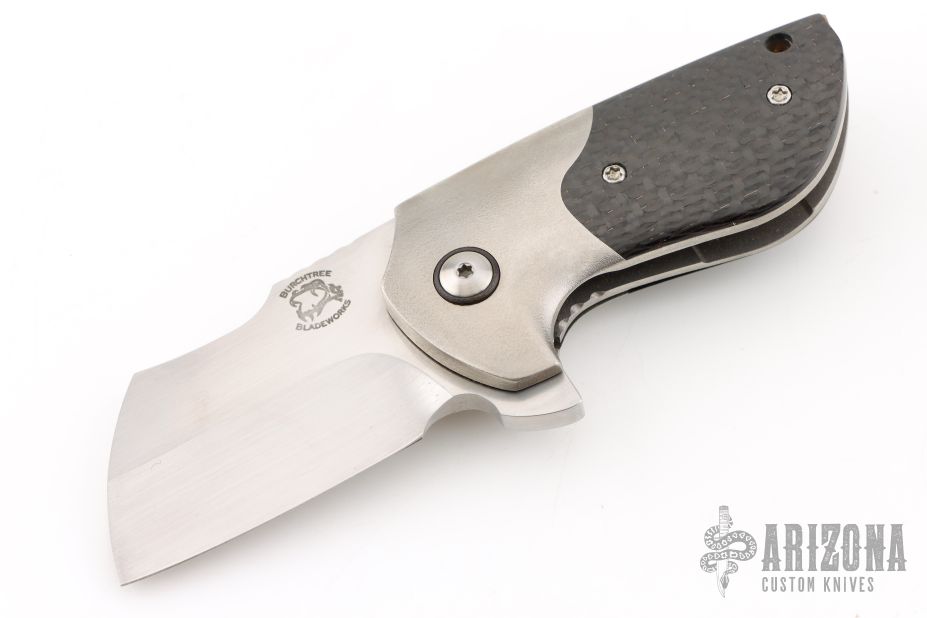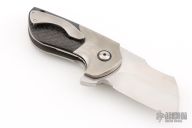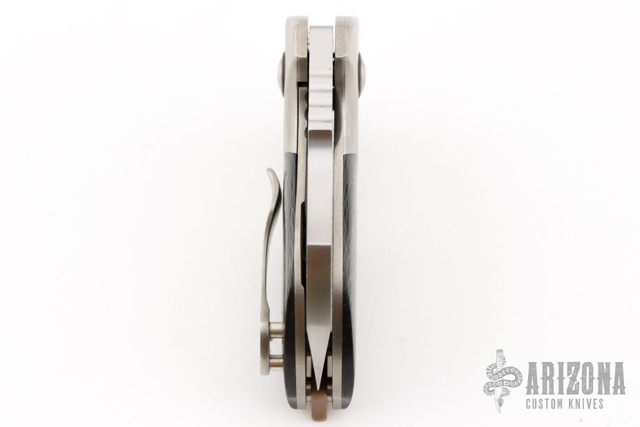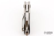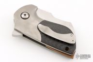 This Micro Flipper from Michael Burch features a hand rub satin finish drop point blade with notched thumbrest and flipper. The handle is comprised of a bead blast finish titanium frame, copper pivot collars and floating backspacer, tip up titanium clip. Rides on bearings, nice detent, lockup and blade seating. Comes with a knife case. Has a couple light scuffs, excellent condition otherwise.