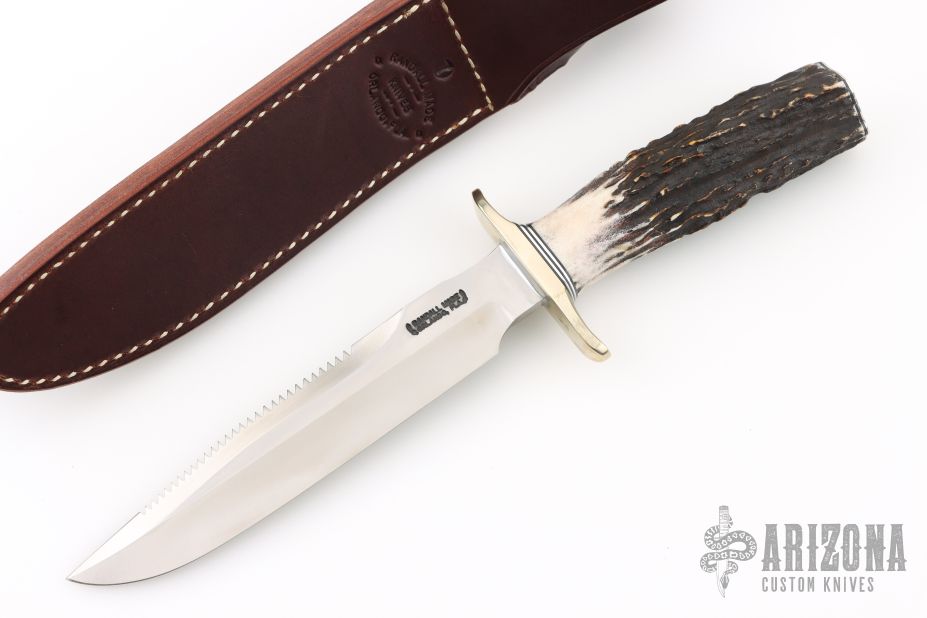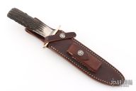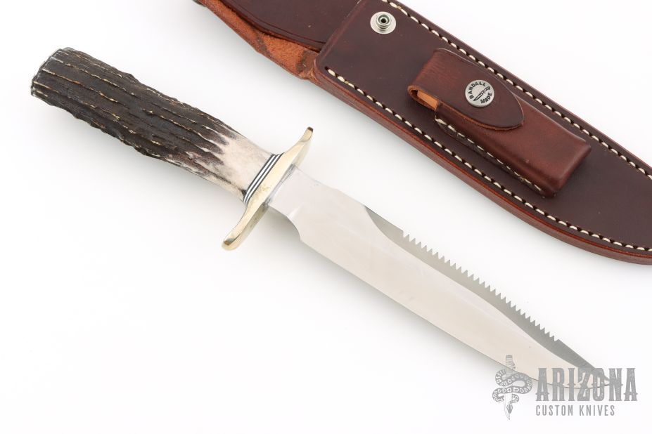 The Model 1 was made famous by Allied combat troops in World War II and has since been widely used in all theaters of war. .224" blade stock. 1.245" blade depth, satin finish blade with sharpened top edge and sawteeth on the spine. The handle has a nickel silver guard, incredible stag grip, black/duralumin spacers, and nickel silver butt plate. Comes with brown leather sheath. Excellent condition.