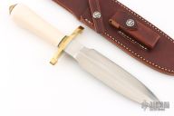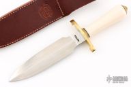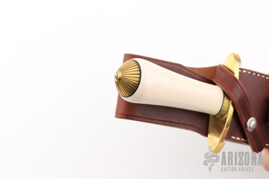 This Tom Clinton Special by Randall Made Knives has a double-edged stainless steel satin finished blade, 235" blade stock and 1.629" blade depth, hidden tang construction. The handle has a lugged brass guard, ivorite grip, scalloped brass coolie cap butt. Comes with a brown leather sheath. Excellent condition.