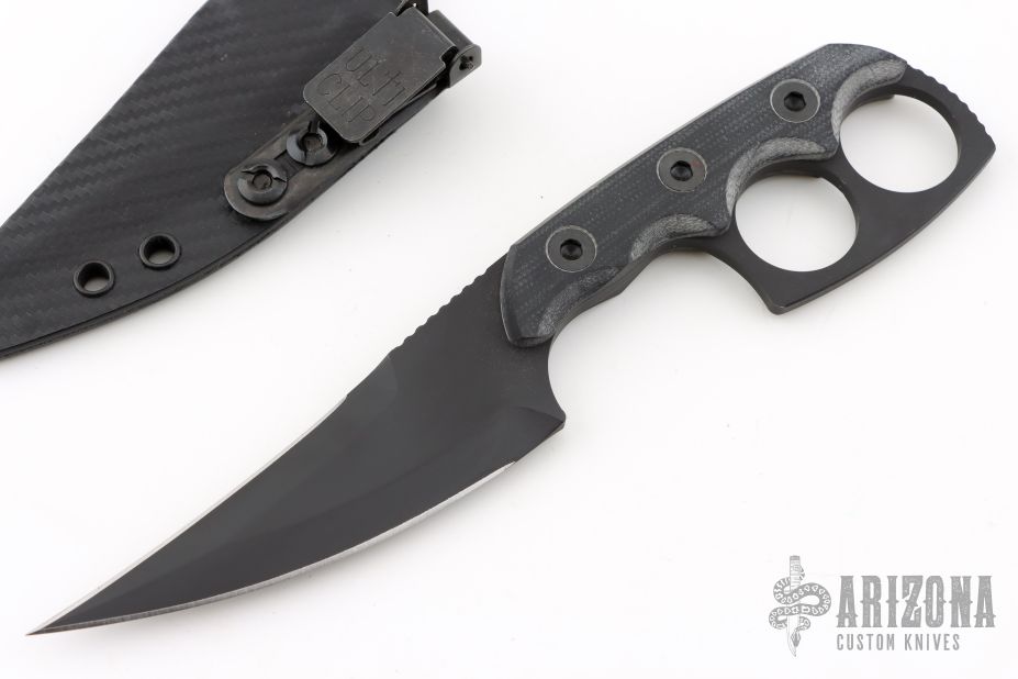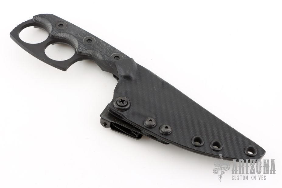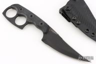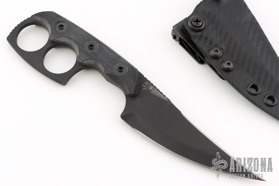This knife by Apex Offensive, Half Face Blades and WEKBD features a black double edged blade with notched thumbrest, full tang construction, .144" blade stock and 1.271" blade depth. The handle features black G-10 scales with a 1" rings. Includes a black carbon fiber style kydex, leather-lined sheath. Has a couple light scuffs, otherwise Excellent Condition.