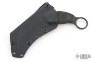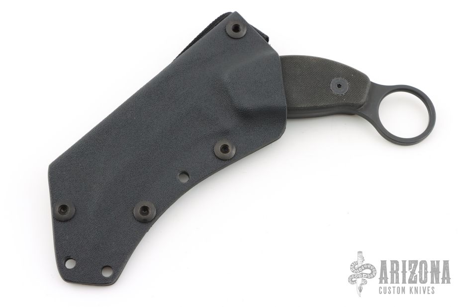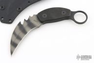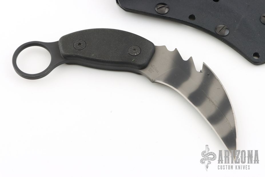 This MSC PS Karambit by Mick Strider features a tiger striped blade with sharpened top edge, .157" blade stock and 1.330" blade depth, full tang construction. The handle has black G-10 scales, ring at the butt. Comes with kydex sheath. Has sheathing marks, and some light scratches otherwise the knife is in excellent condition.