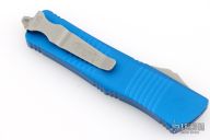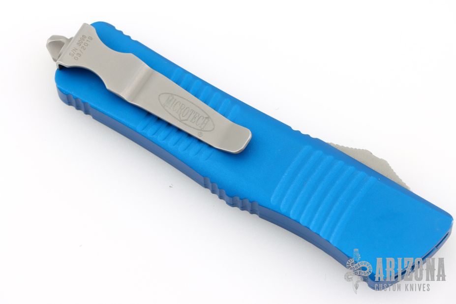 This Troodon by Microtech features a stonewash finished blade. The handle has a blue aluminum frame with blasted hardware and tip down clip. Comes with original box and papers. Dated 03/2019 and s/n 3098. Has some light scuffs and wear on the frame edges, otherwise good condition.