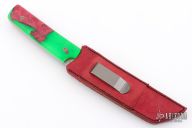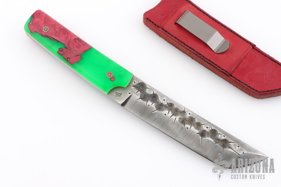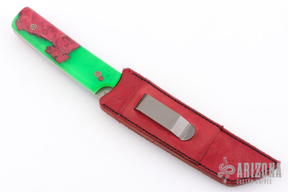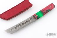 This Tanto by Borlla Blades features a satin finished chisel ground blade with carved flats, .215" blade stock and 1.166" blade depth, full tang construction. The handle has resin/wood scales with white liners and mosaic pins. Comes with a red leather sheath with hand tooling. Excellent condition.