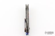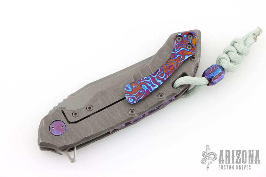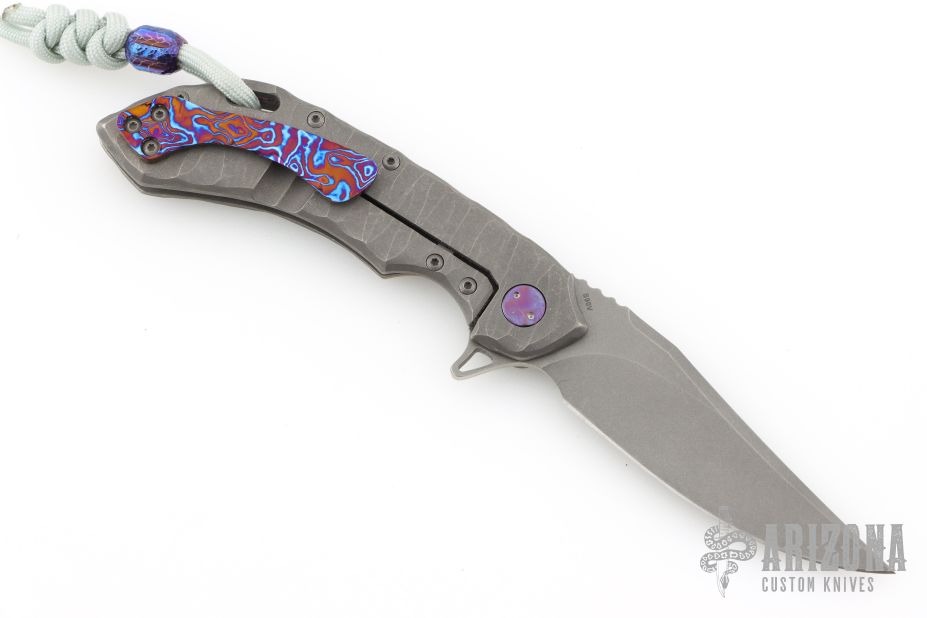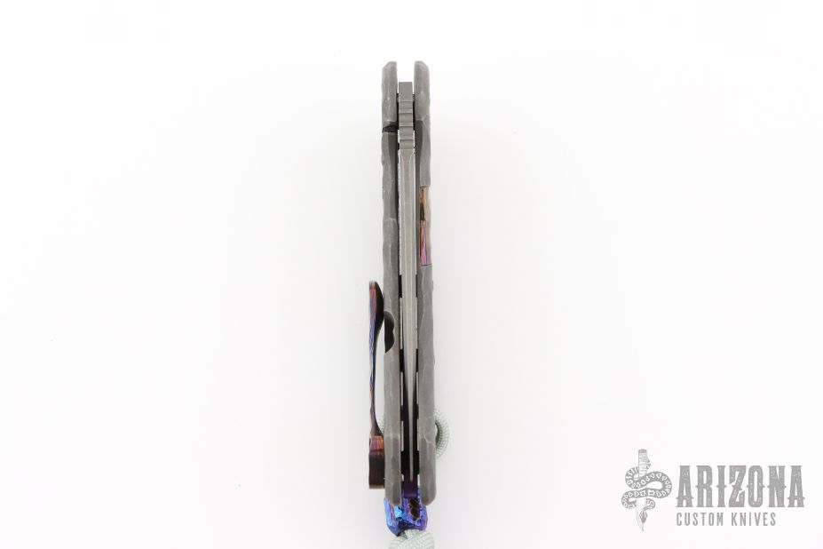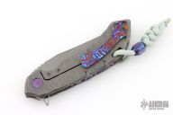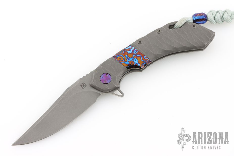 This Wayfarer 247 from Olamic Cutlery features a stonewash finished Bowie blade notched thumbrest and flipper. The handle has a stonewashed and sculpted titanium frame with a timascus inlay, timascus pocket clip is positioned for tip up carry, floating and sculpted titanium backspacer. The Wayfarer 247 is very comfortable in the hand and flips well with no wrist action needed. Blade is centered when closed and locks up with no play. s/n T185B. Comes with original zippered and COA dated  2/6/25. Excellent condition. ONE OFF