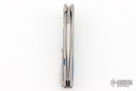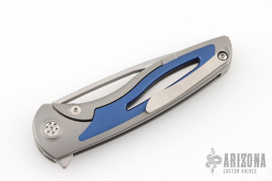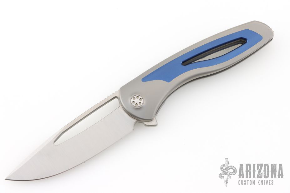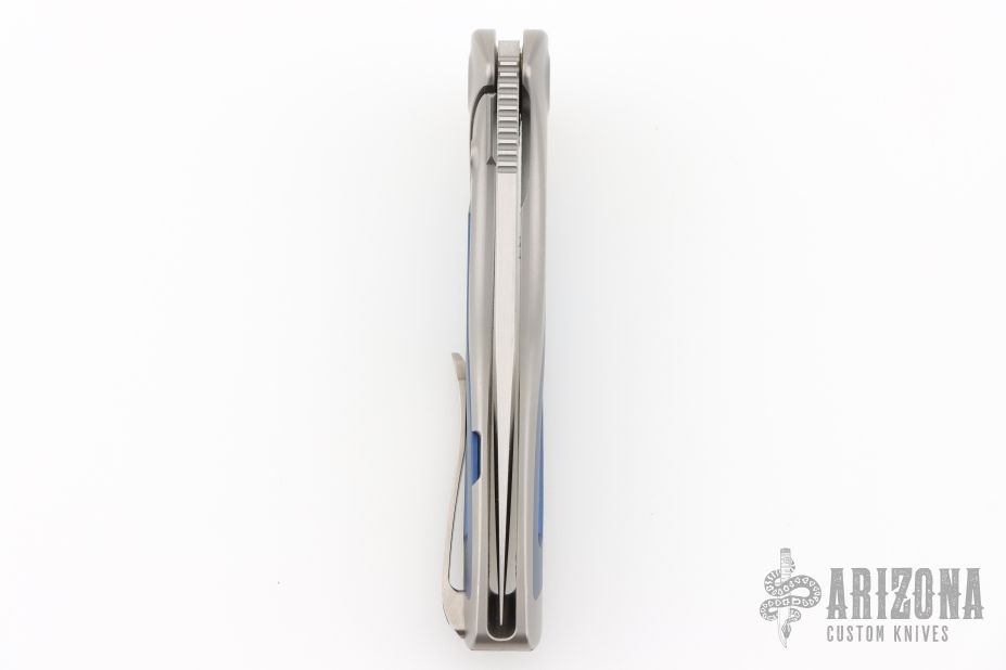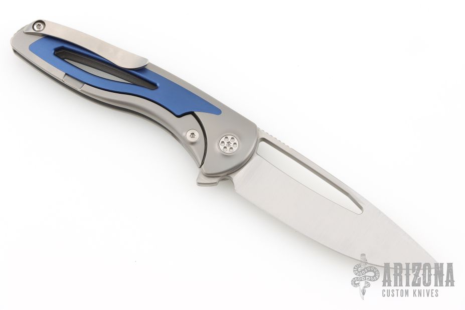 This Apex Flipper from Brian Nadeau features a satin finished blade with a thumbhole, flipper and notched thumbrest. The handle is comprised of a grey titanium frame with blue aluminum inlays, satin titanium tip up clip. Rides on bearings, nice detent, lockup and blade seating, stainless lockface insert. Comes with original box. Has a few light scratches, otherwise excellent condition.