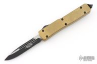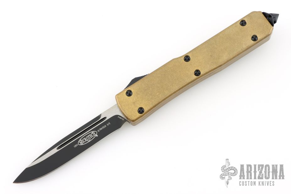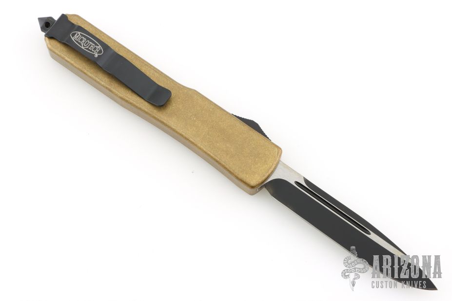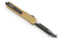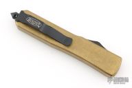 This Ultratech OTF automatic by Microtech features a black blade with fullers. The handle has a stonewashed brass frame with a black stainless steel clip and hardware. Comes with original box and papers. Excellent condition.