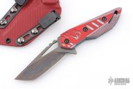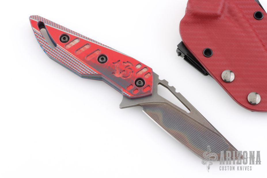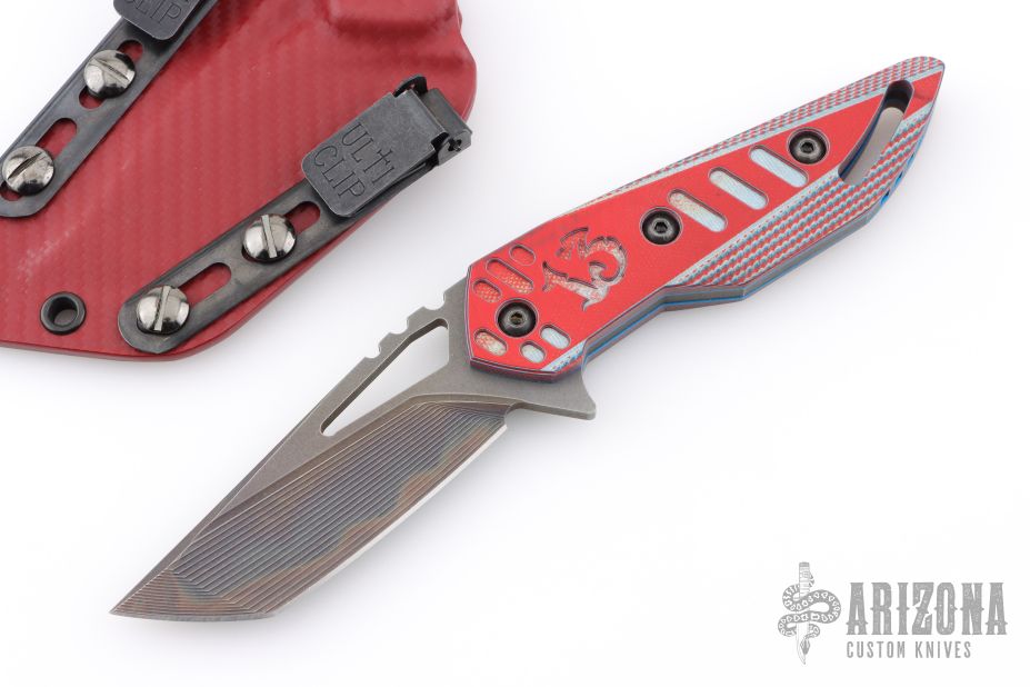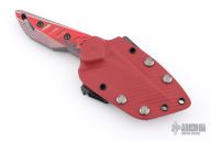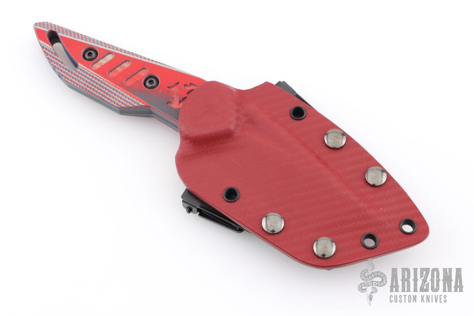 This knife by Grissom features a milled blade with battle worn finish, notched thumbrest, .169" blade stock and 1.272" blade depth, full tang construction. The handle has milled G-10 scales with blue liners. Comes with a kydex sheath. Excellent condition.