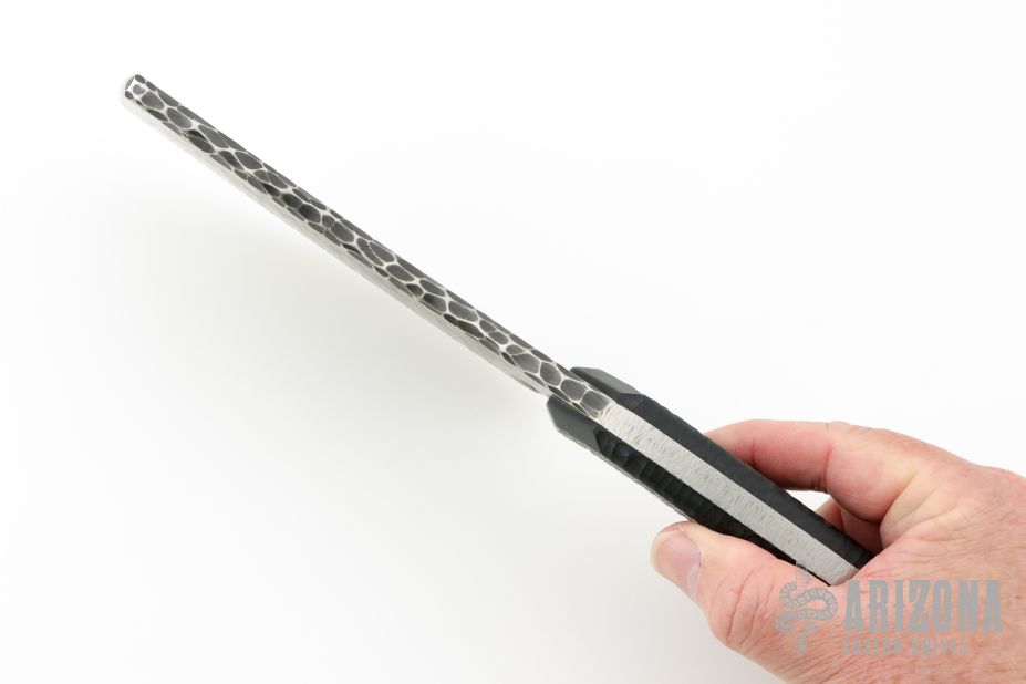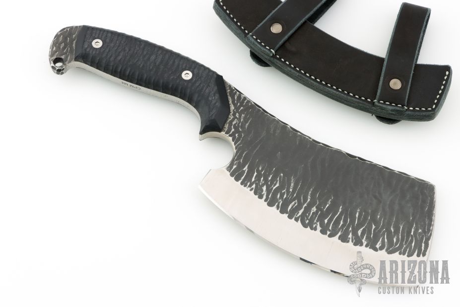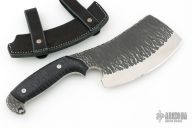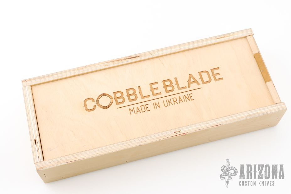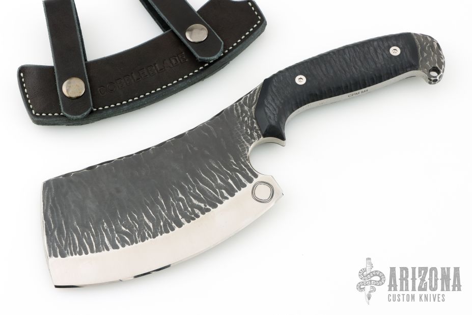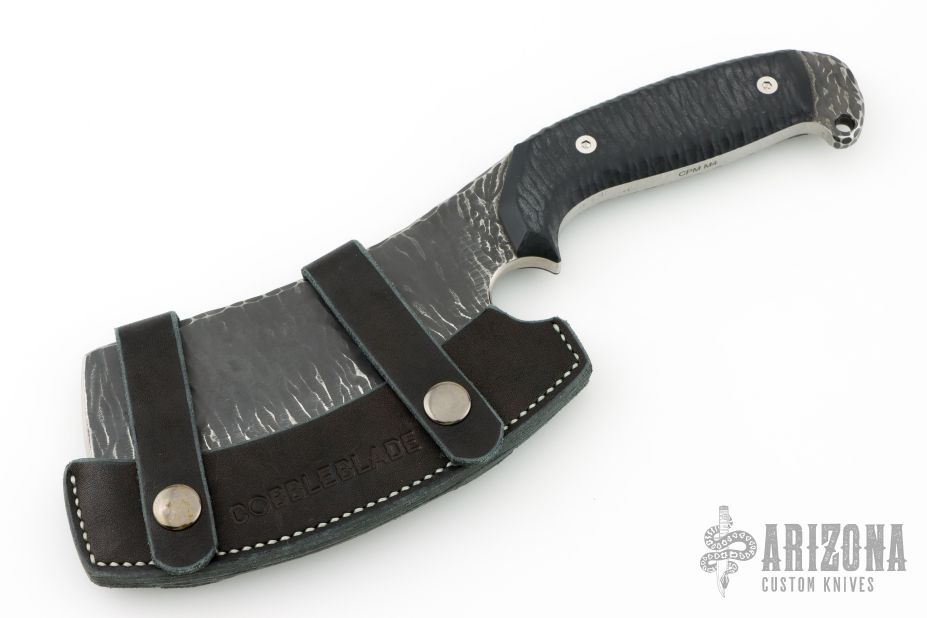 This Cleaver by Cobble Blade features a textured blade with satin finished grinds, .298" blade stock and 3.625" blade depth, full tang construction. The handle has textured black G-10 scales, extended tang with lanyard hole. Comes with black leather blade cover, original box and COA dated 8-2-2017. Excellent condition.