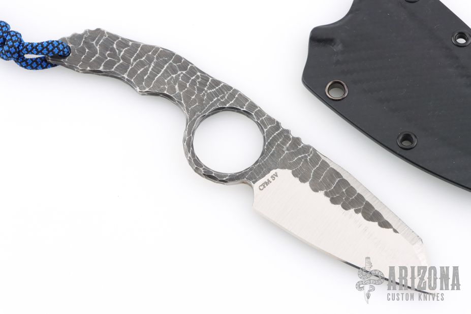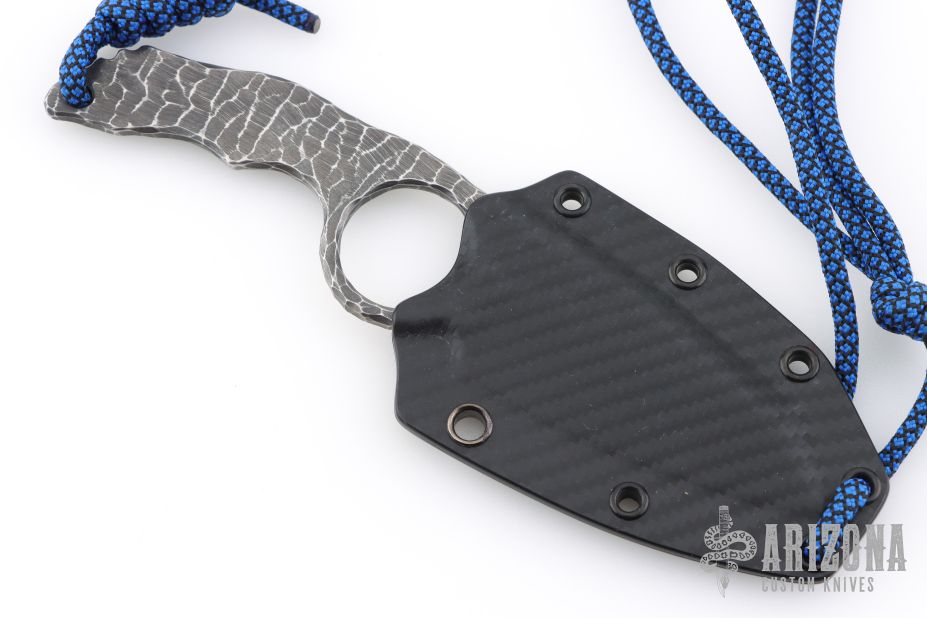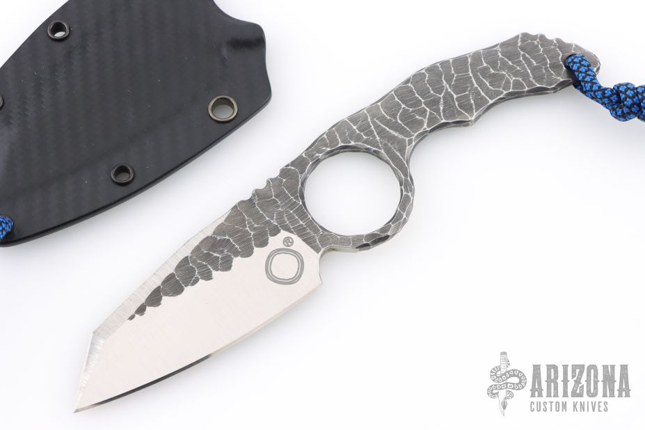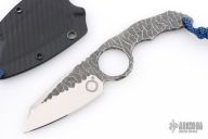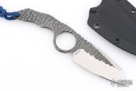 This knife by Cobble Blade features a satin finished blade with textured flats, handle and spine, .153" blade stock and 1.336" blade depth, full tang construction. The handle has a textured finish with lanyard hole at the butt, textured tang. Comes with kydex neck sheath and original box. Excellent condition.