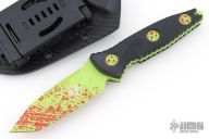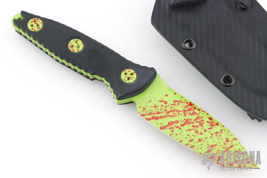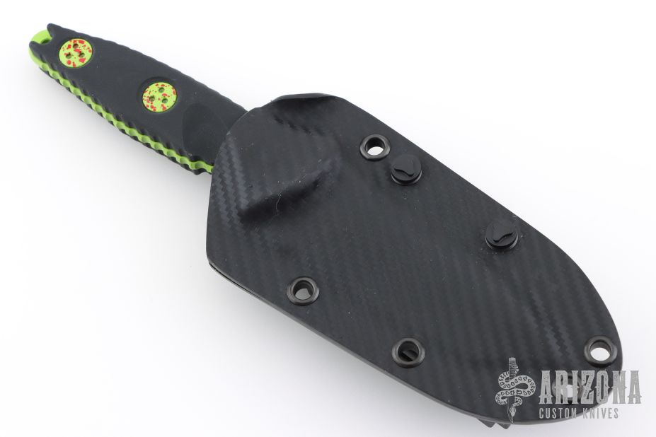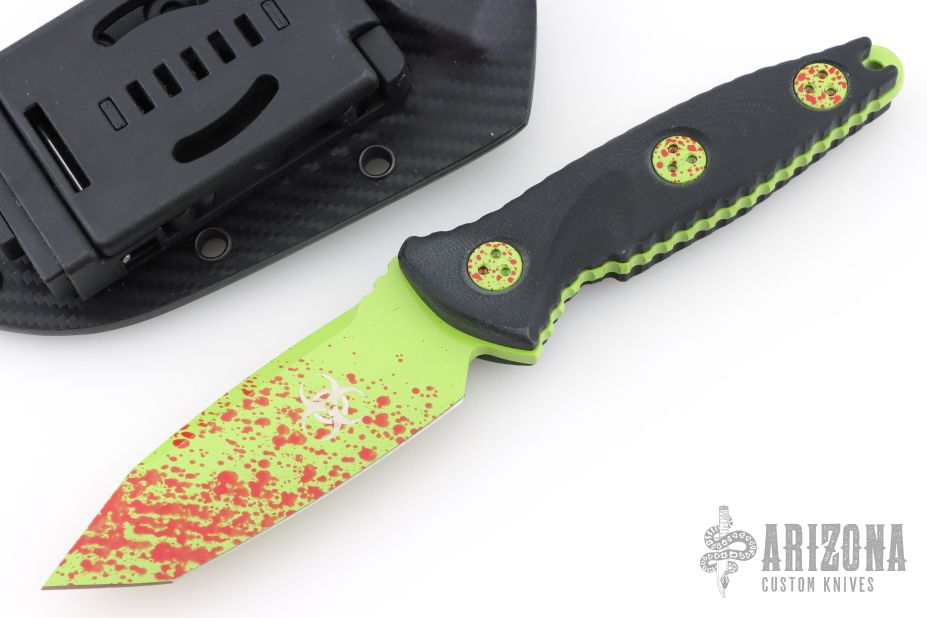 This Mini Socom Alpha by Microtech features a green tanto blade with a notched thumb ramp and a full tang construction, .164" Blade Stock. 1.194" Blade Depth. The handle features black G10 scales. Includes a kydex sheath with a belt clip. Excellent Condition. Comes with original box and papers.