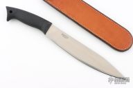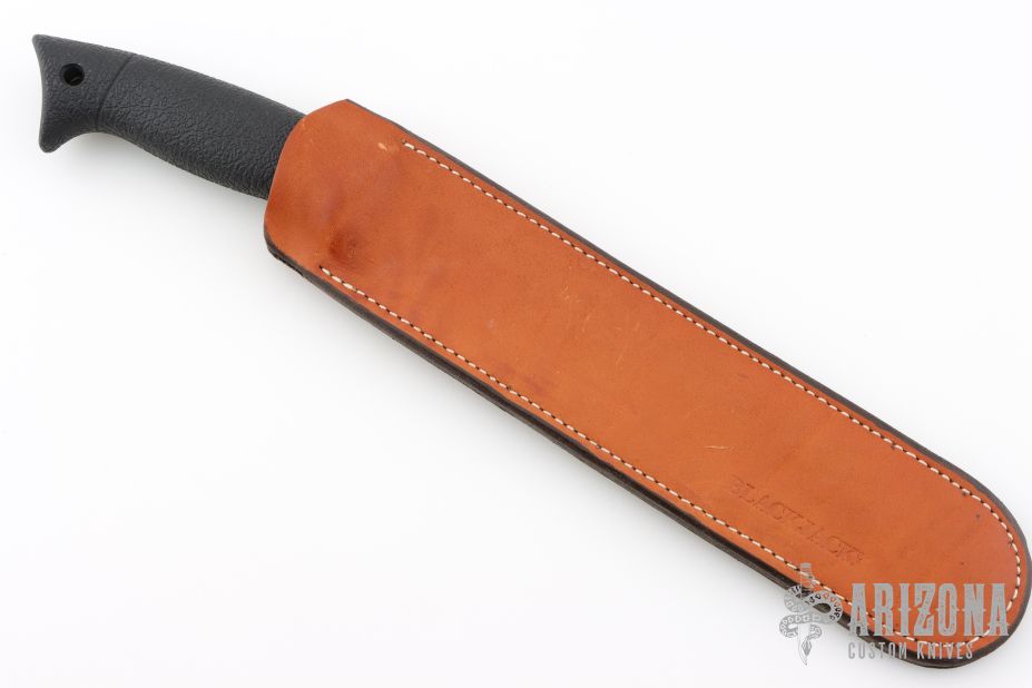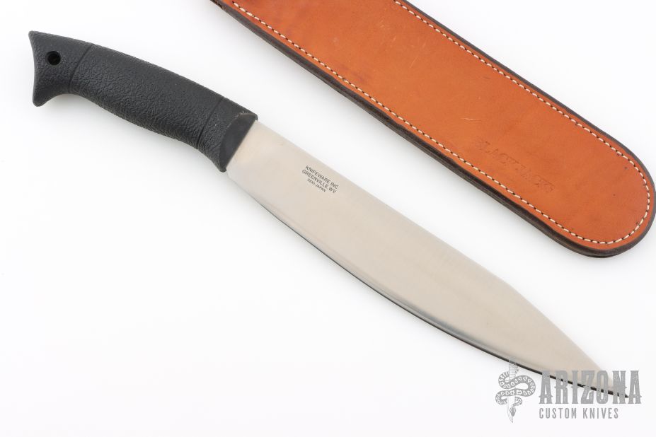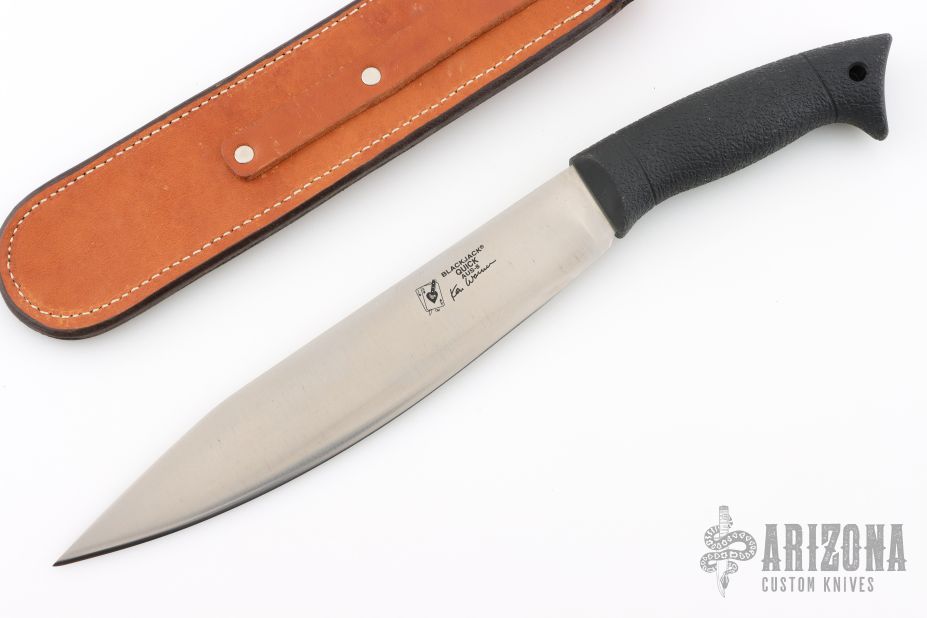 This Quick by Blackjack Knives was made in Greenville WV. It features a satin finished blade with .159" blade stock and 1.715" blade depth, hidden tang construction. The handle has a textured rubber grip with lanyard hole. Comes with a brown leather sheath. Excellent condition.