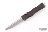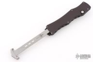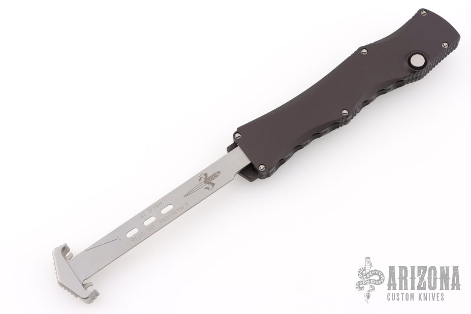 The Halo IV by Microtech knives features a two-tone Apocalyptic finished blade with satin flats. The handle has a black aluminum frame with blasted stainless steel hardware and charging handle. Dated 01/2016. Includes the original box, sheath, and metal COA. Has a couple light scuffs, otherwise excellent condition.