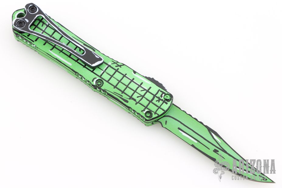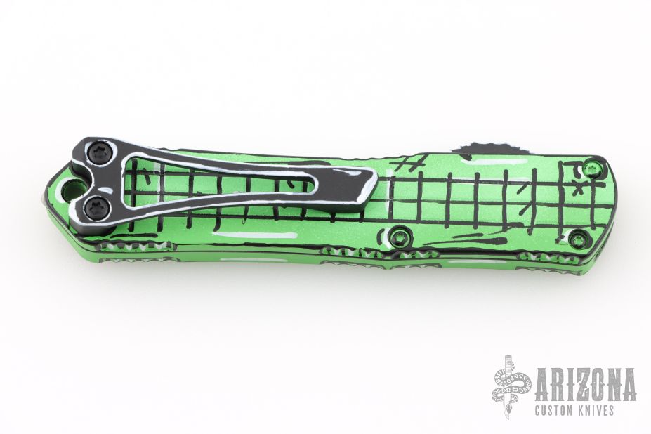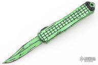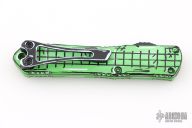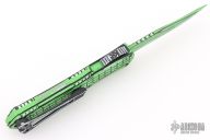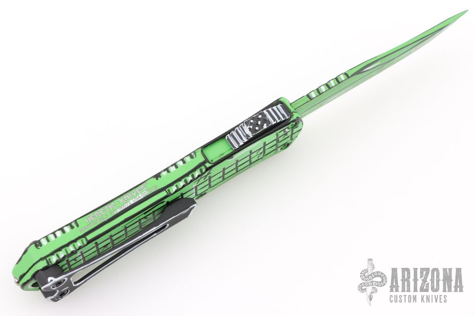 This Manticore-S by Heretic Knives features a bowie blade. The handle has an green/white/black aluminum frame with matching black stainless steel tip down clip. S/N 072. Comes with original box, and lube. Excellent Condition.
