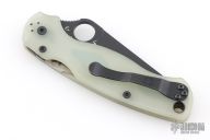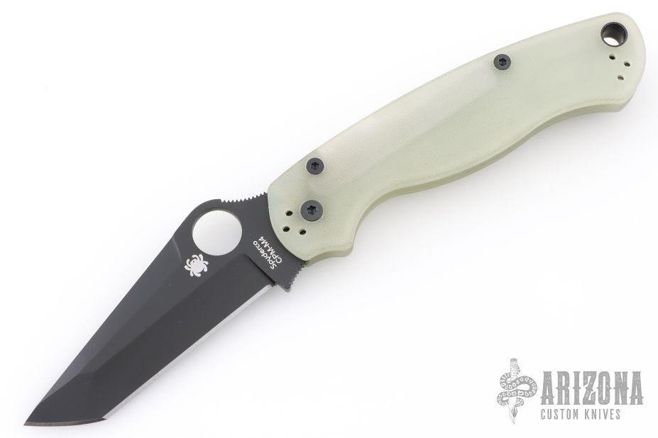 This G81GM4BKP2 Paramilitary 2 by Spyderco features a black tanto blade with thumb hole, notched thumb ramp and choil. The handle has a textured jade G10 scales over a stainless steel subframe and lockbar. 4 way adjustable pocket clip and lanyard tube in pommel. Includes original box and paperwork. Excellent condition.
