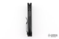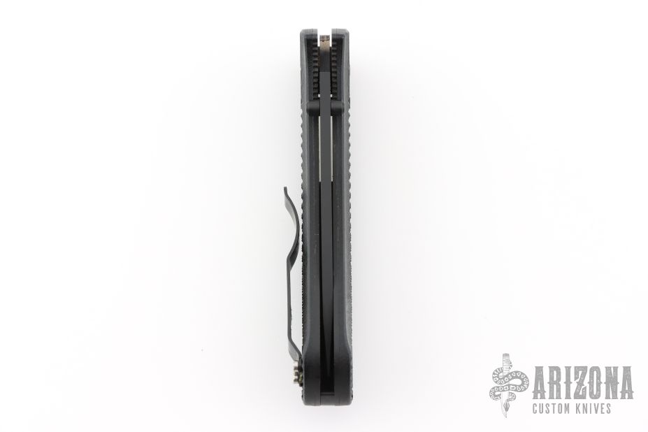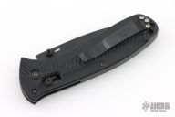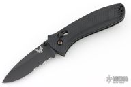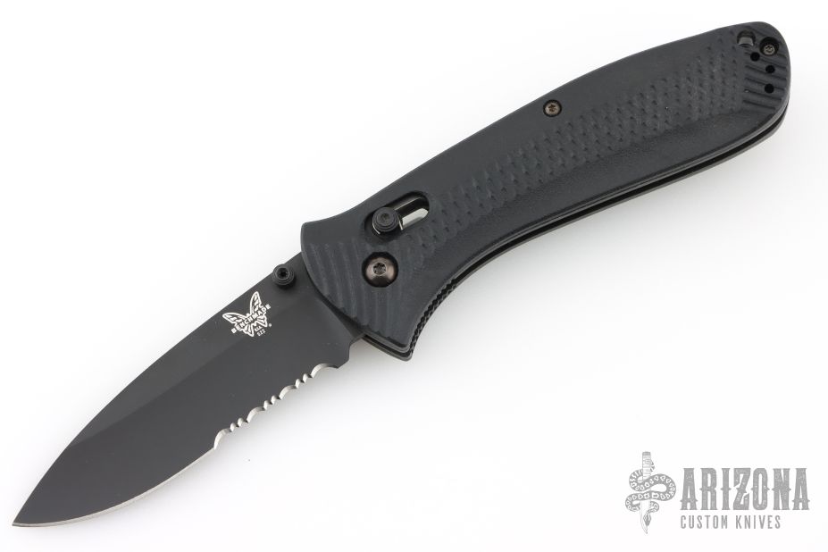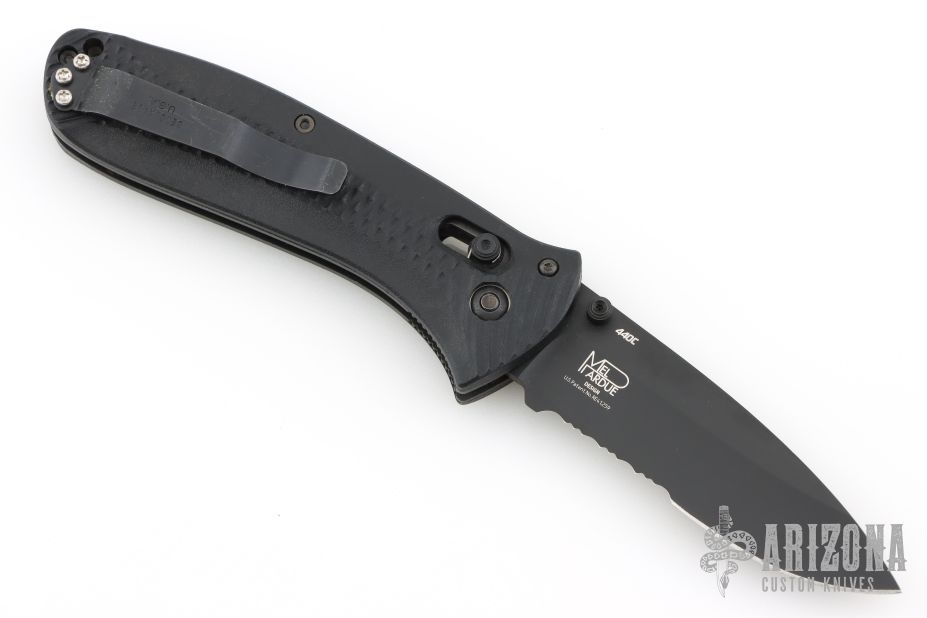 This axis-locking folder by Benchmade features a black partially serrated blade with dual thumb-studs. The handle has black FRN scales, black stainless steel liners, and a black stainless steel tip up clip, right or left. Comes with original box and papers. Excellent condition.