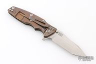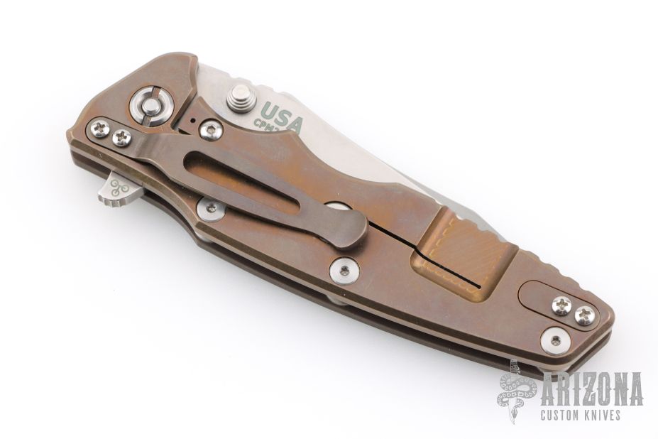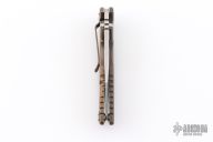 This Eklipse from Rick Hinderer features a stonewash finished blade with notched thumbrest and flipper. Textured titanium scale and anodized/stonewashed titanium frame and pocket clip. Dual thumb studs and notched thumbrest. Reversible pocket clip. Strong lock up, nice detent and blade seating is center. Includes original box and extra washers. Comes with original OD G10 scale, and anodized liner. Excellent condition.