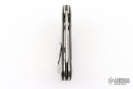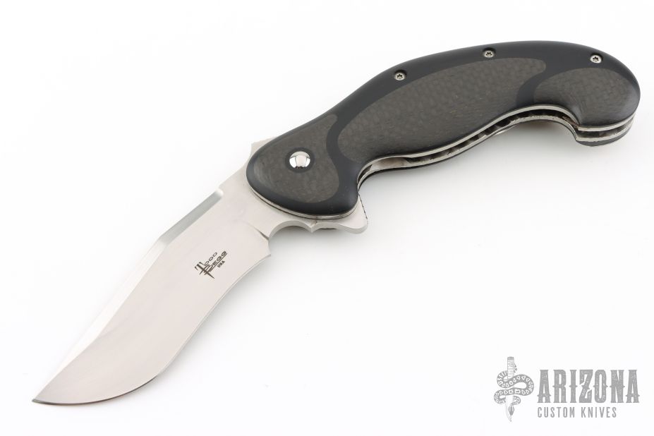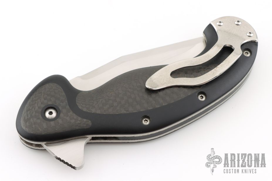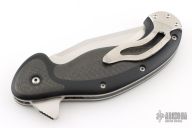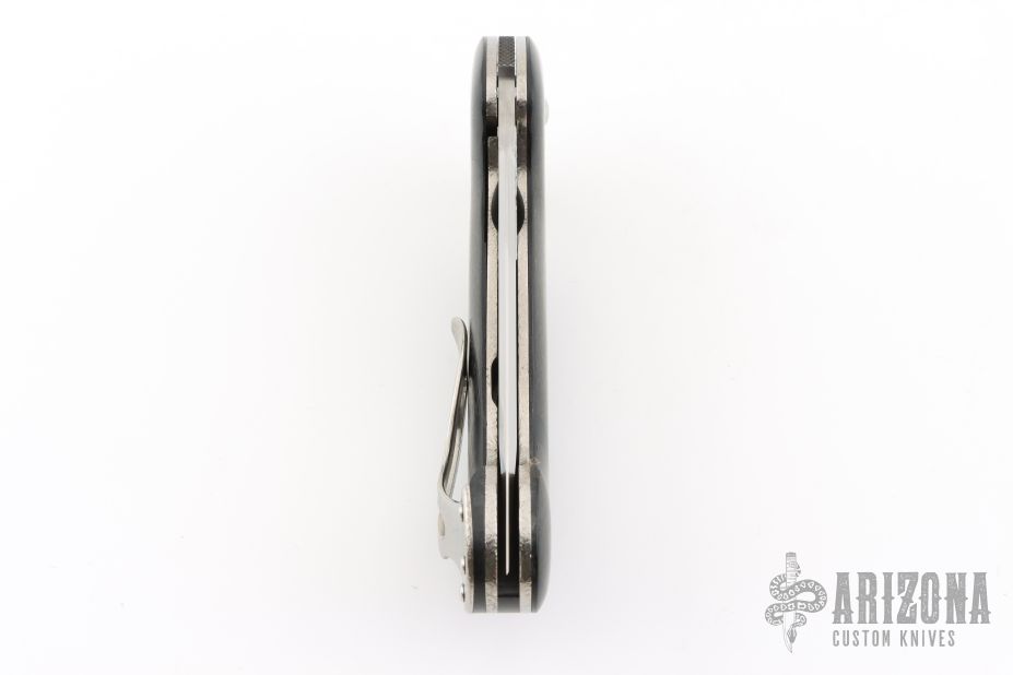 This Front Line linerlock flipper by Todd Begg features a hand-rubbed satin finish blade with checkered thumbrest and flipper. The handle has black G-10 scales with lightning strike carbon fiber inlays. Liners, and clip are titanium and have a jeweled ice texture. Black G-10 backspacer. Includes IKBS (Ikoma-Korth Bearing System) for smooth and fast flipper opening that requires no wrist action. Nice blade seating, lockup, and detent. Outstanding work. Excellent condition. Comes with a zippered case.