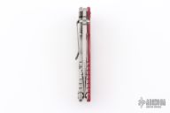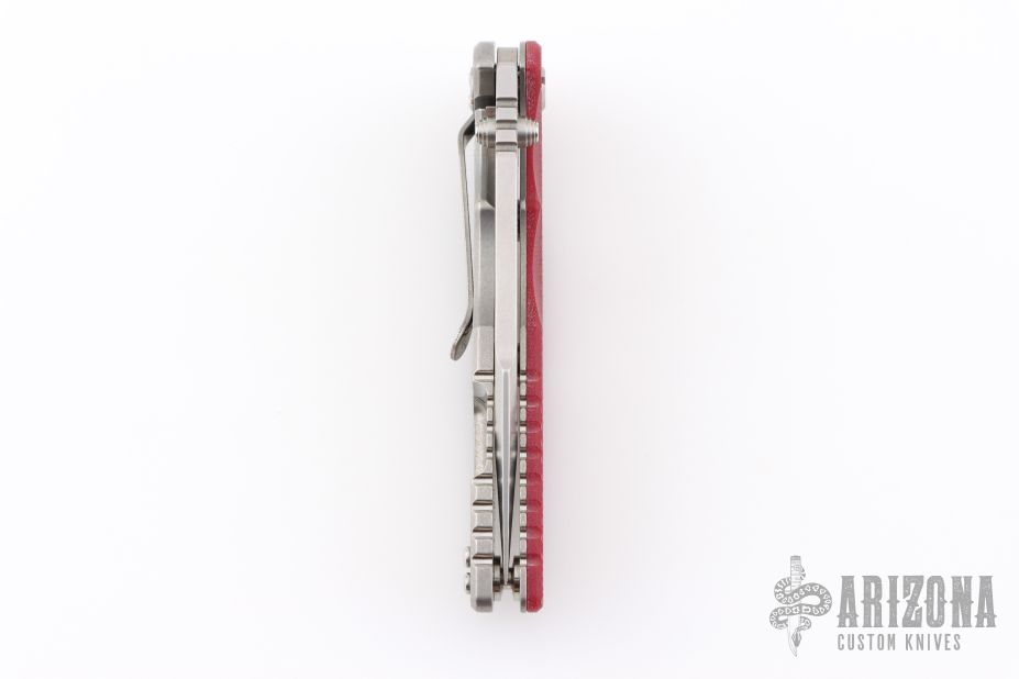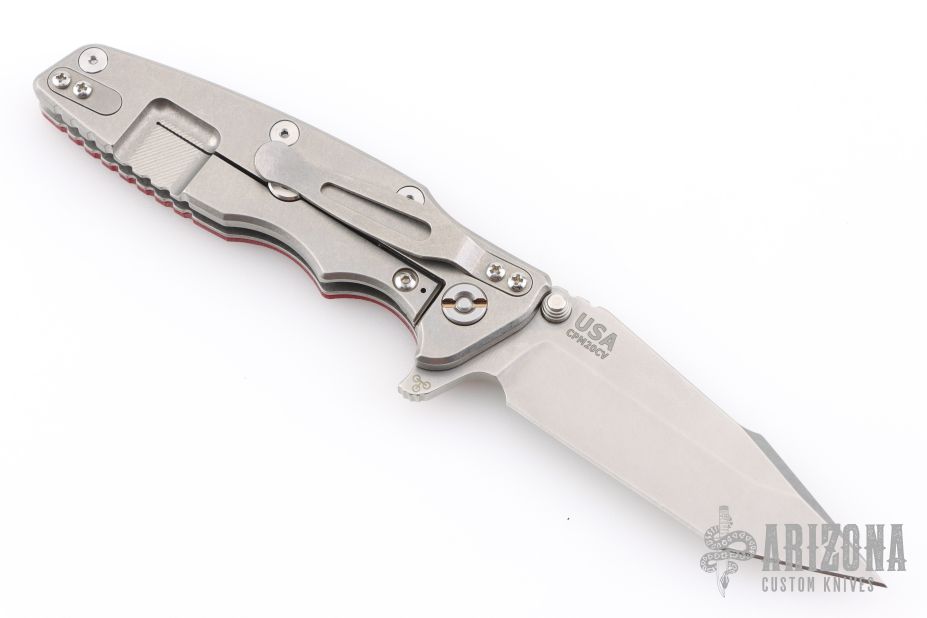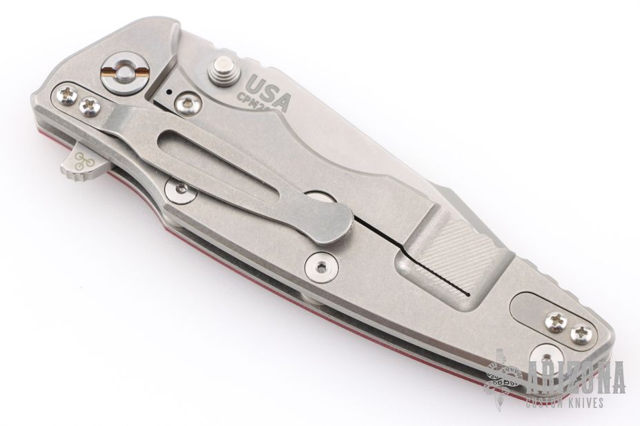 This Eklipse from Rick Hinderer features a stonewash finished blade with notched thumbrest and flipper. Red G-10 scale and stonewashed titanium frame and pocket clip. Dual thumb studs and notched thumbrest. Reversible pocket clip. Strong lock up, nice detent and blade seating is center. Includes original box, original orange g10 scale, and extra washers. Excellent condition.