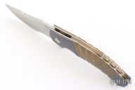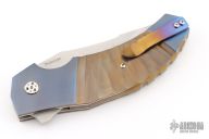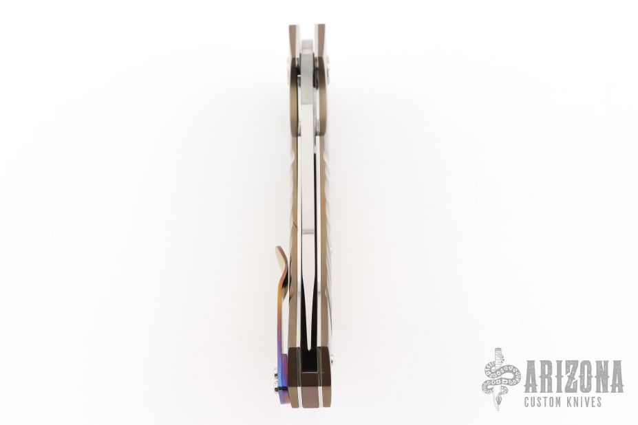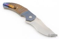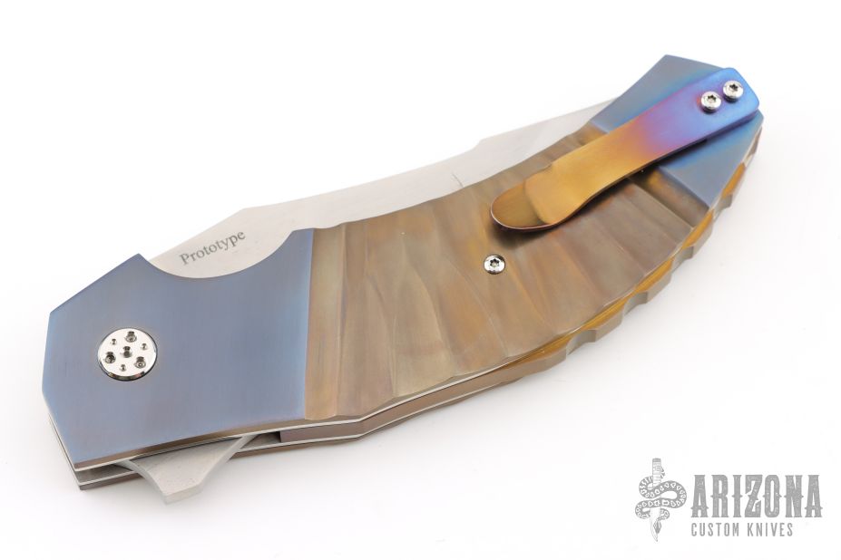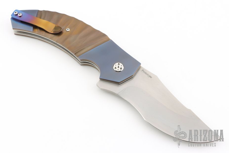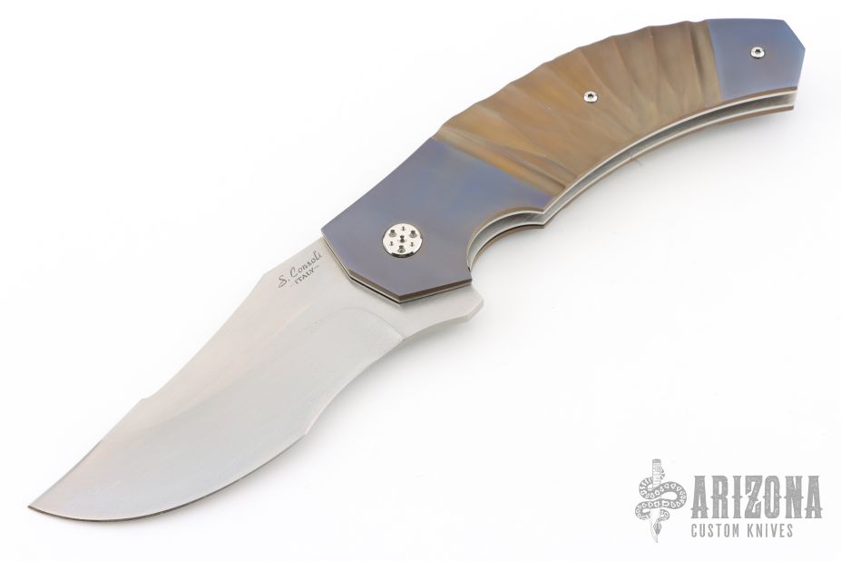 This N° 260 linerlock flipper by Sergio Consoli features a hand-rub satin finished upswept recurve blade with flipper. The handle has textured and two-tone anodized titanium scales, Inox steel liners, and an anodized titanium backspacer and tip up clip. Sergio's ball bearing system gives the knife an effortless flip that requires no wrist action. Nice lockup, detent and blade seating. Outstanding work. Excellent condition. Comes with zippered case. PROTOTYPE