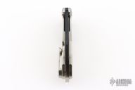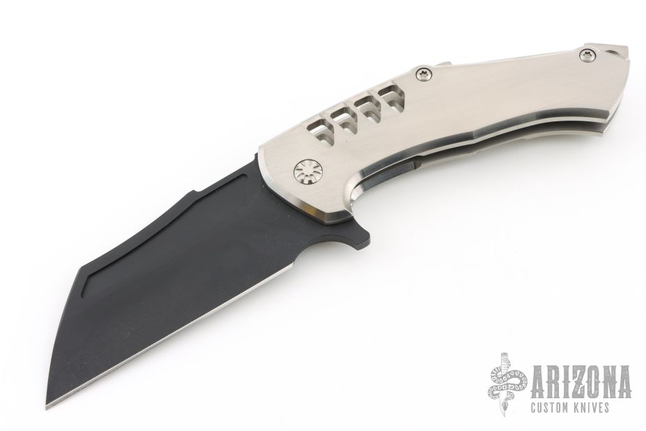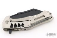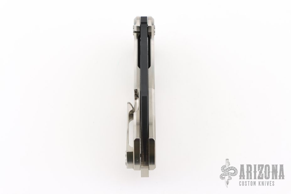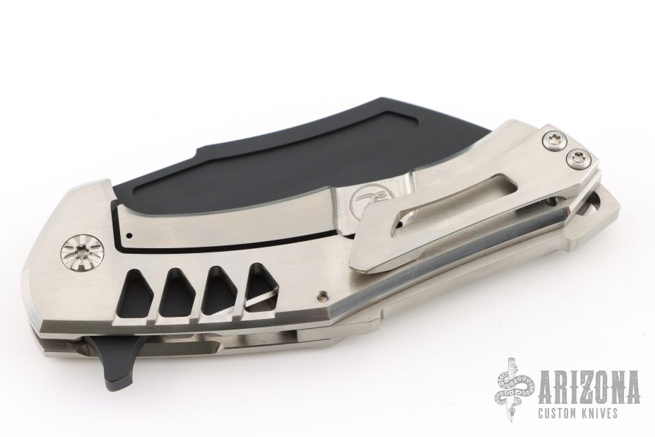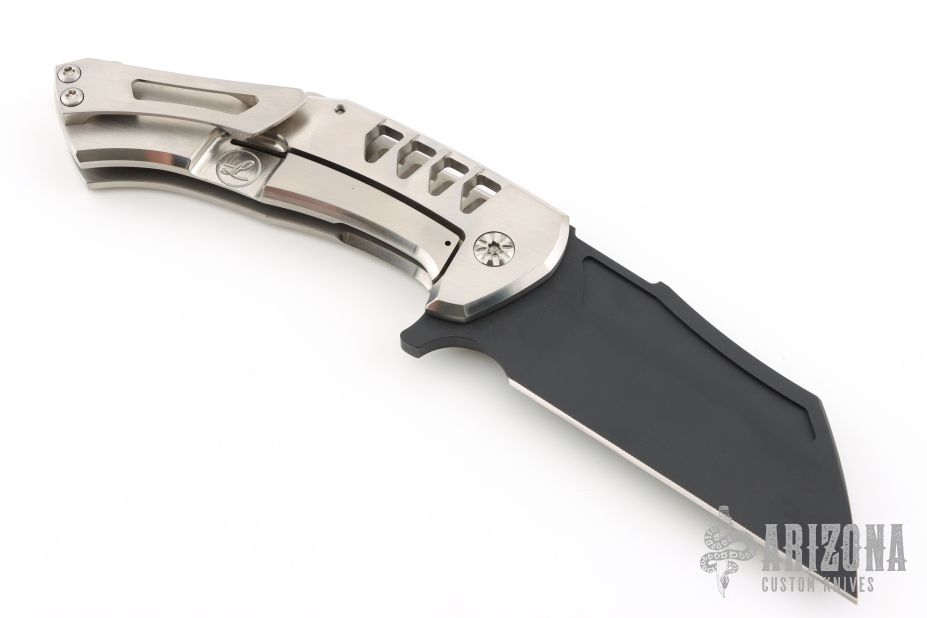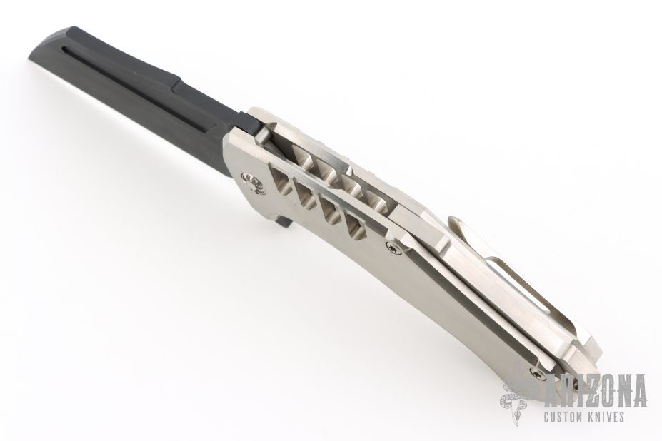 This Warnaught by Eric Luther features a black blade with milled bevels, fullers and a flipper. The handle has a satin finished titanium frame, backspacer and tip up clip. Rides on bearings, nice detent, lockup and blade seating. Comes with a zippered case. Excellent condition.