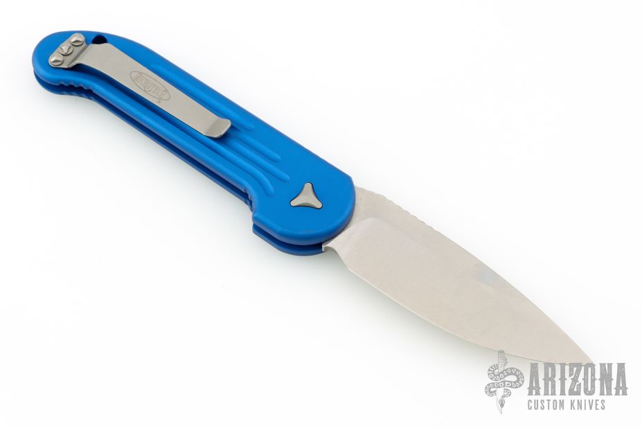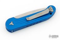 This LUDT side opening automatic by Microtech has a stonewash finished blade with a standard edge and a blue aluminum frame. Stainless steel clip. Dated 11/2015 and serial number 00592. Comes with original box and papers. Excellent condition.