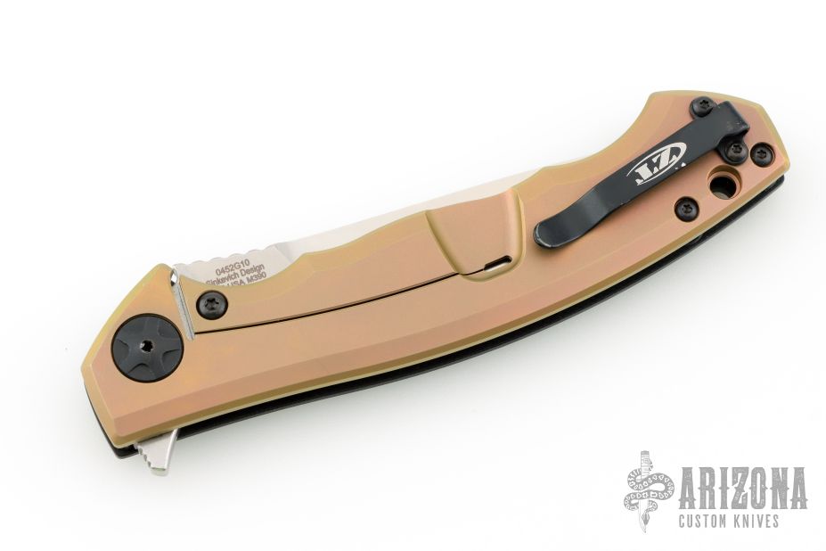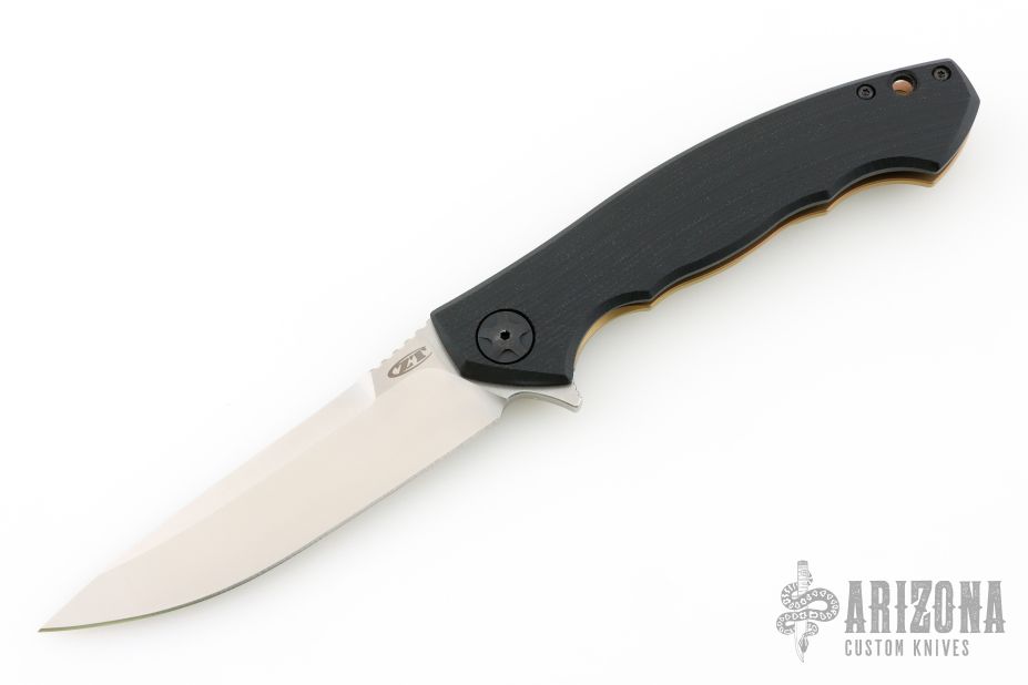This 0452G10 Sinkevich designed folder from Zero Tolerance features a drop point blade with swedge. The blade has tumble finished flats and satin grinds. The handle has a black G-10 scale on the non lock side, and an anodized titanium frame lock on the other, tip up black stainless steel clip. Serial #0436. Has a scratch on the clip, otherwise excellent condition. Comes with original box and papers.