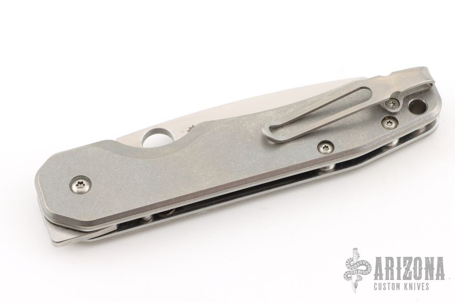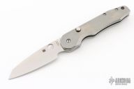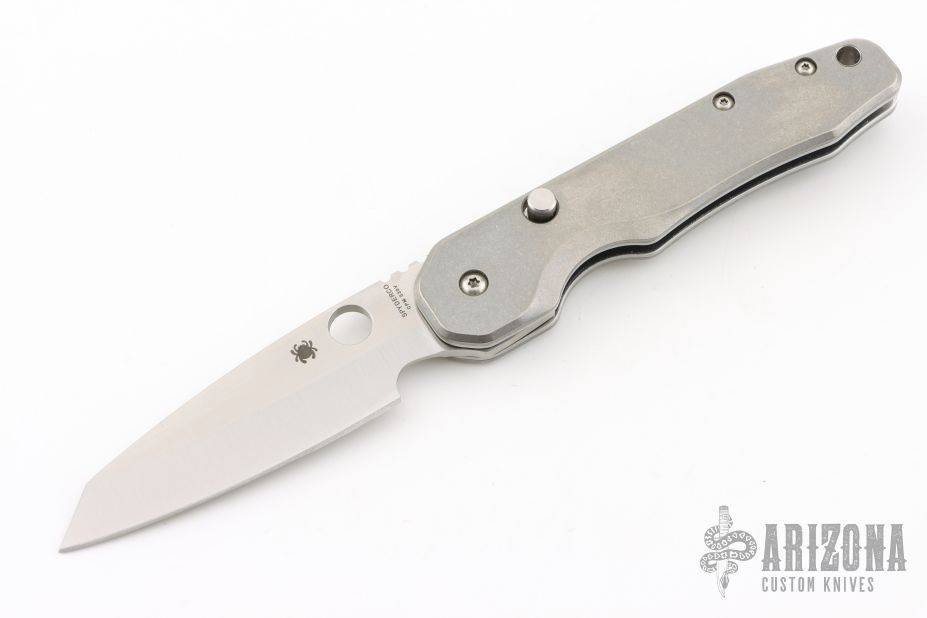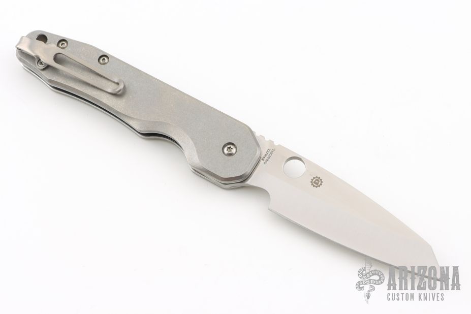 This Smock by Spyderco has a satin finish sheepsfoot style blade. The handle features custom titanium scales over stainless steel liners with a reversible deep carry titanium pocket tip up pocket clip. Comes with original box and carbon fiber scales. Has been resharpened, otherwise excellent condition.